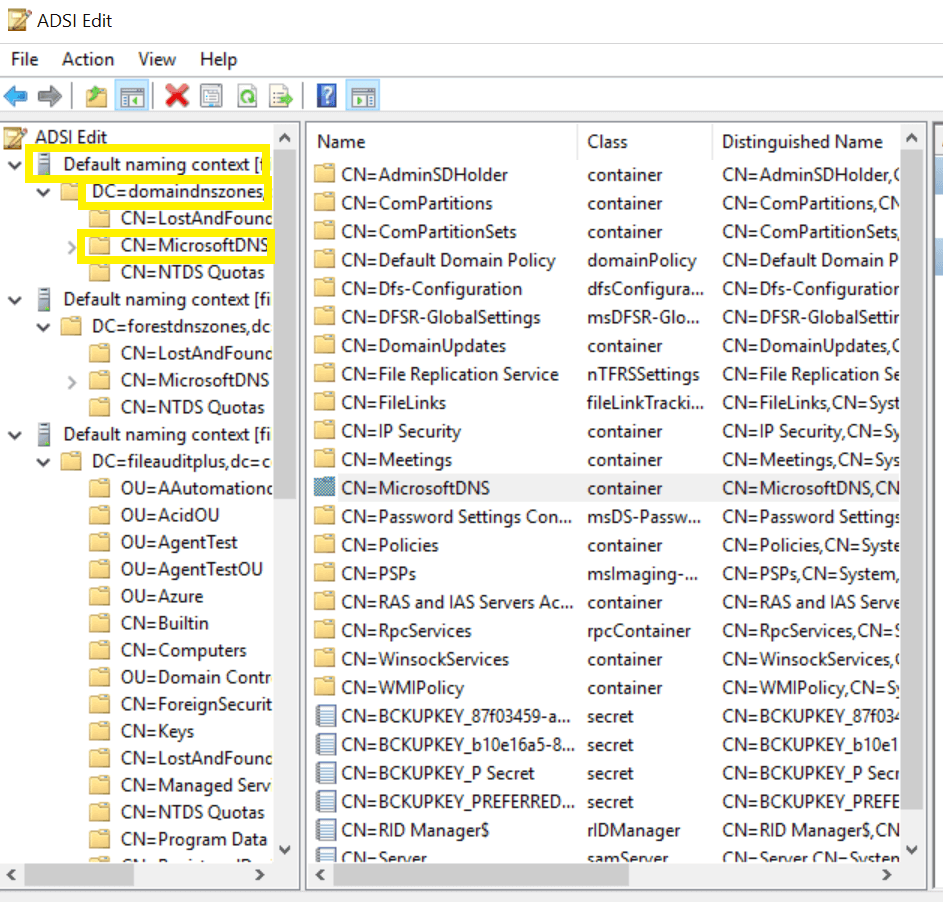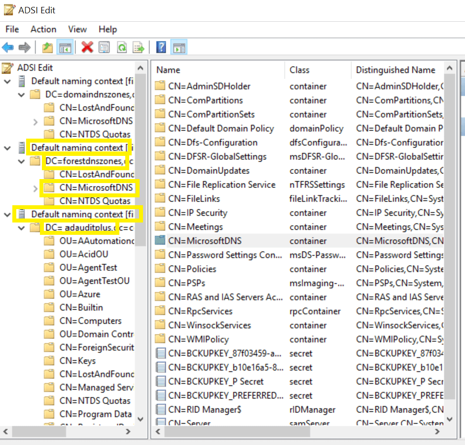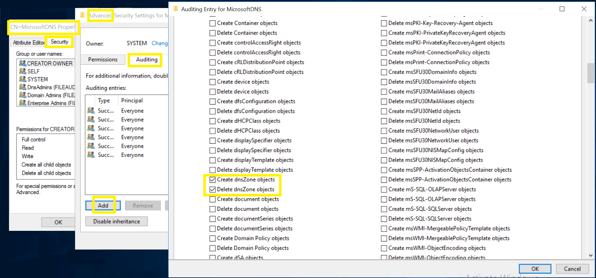 - 导航到左侧面板→单击“默认命名上下文”→右键单击“MicrosoftDNS→选择”安全“→”高级→审核“→”添加“→属性。