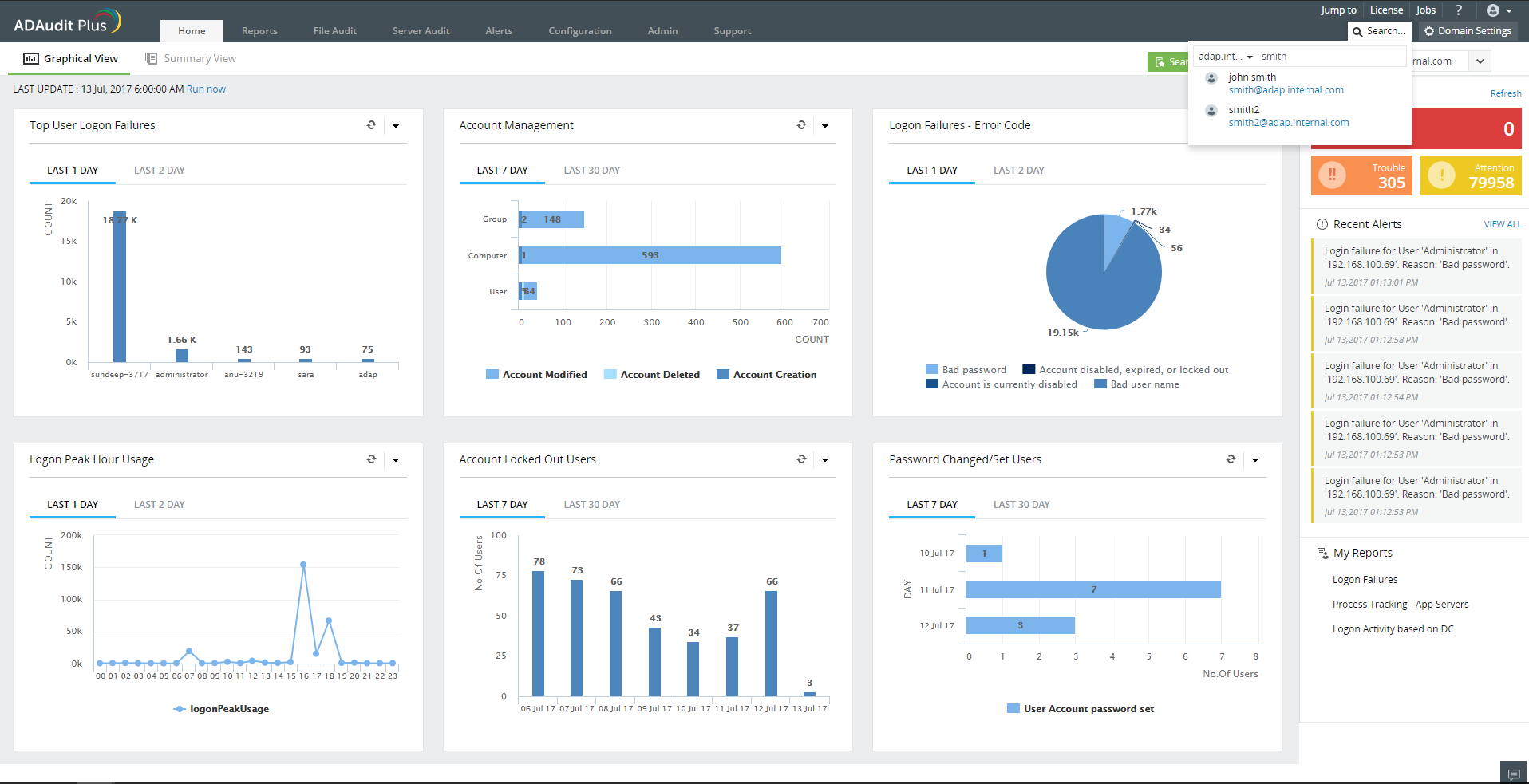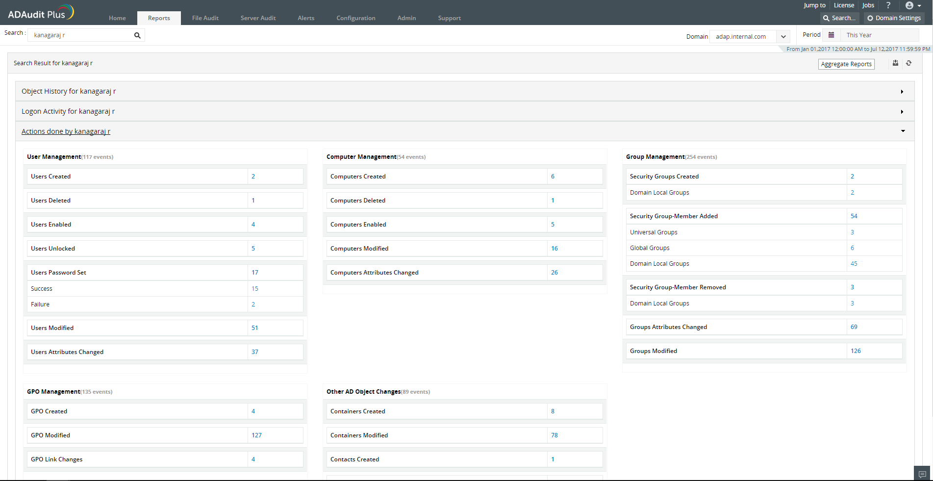 ADAudit Plus为您提供搜索功能,使您能够即时跟踪Active Directory中指定用户的足迹。使用简单而直接,这个搜索需要三个输入 - 您需要对其进行审计跟踪的用户名、域和时间段 - 然后您将立即获得以下合并摘要:
