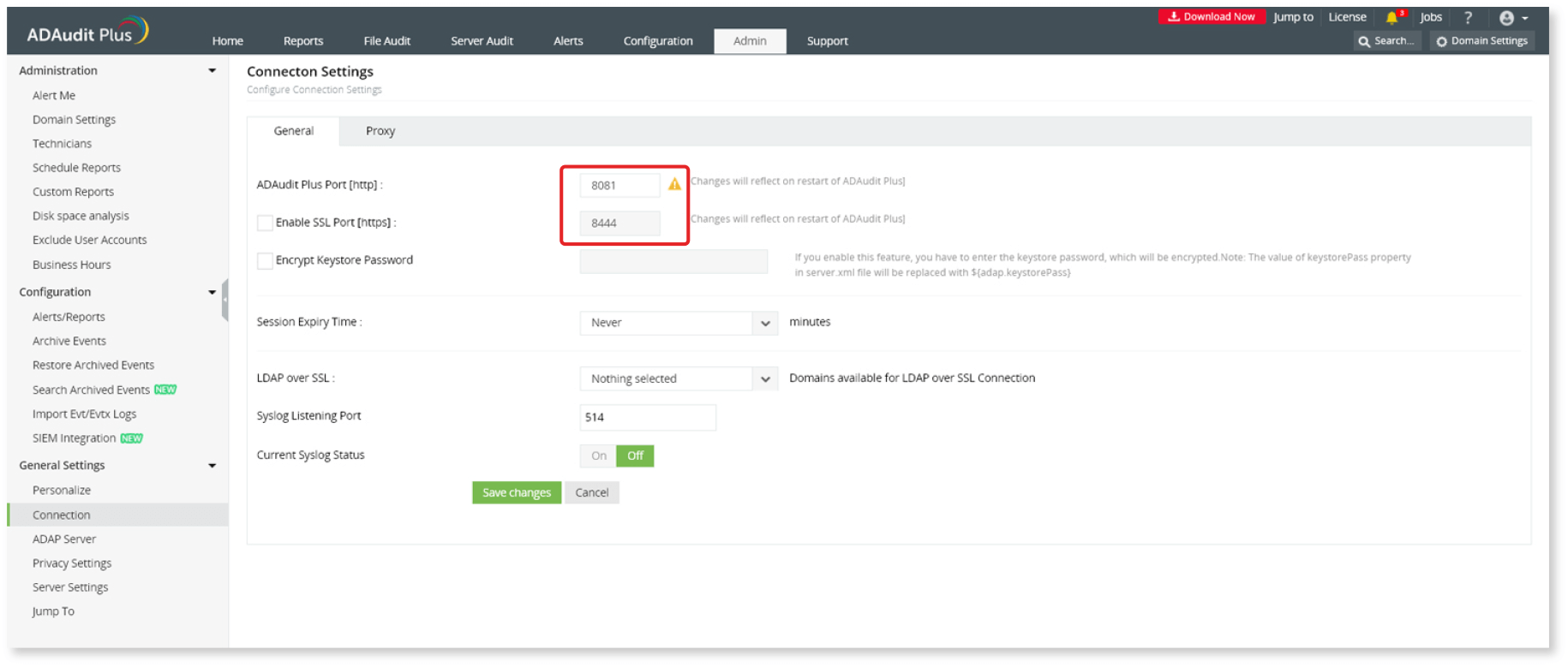 要检查ADAudit Plus使用的端口号和传输协议,请转到“管理”选项卡,然后在“常规设置”下选择“连接”。可以在此处找到ADAudit Plus服务器使用的相应端口号和协议。