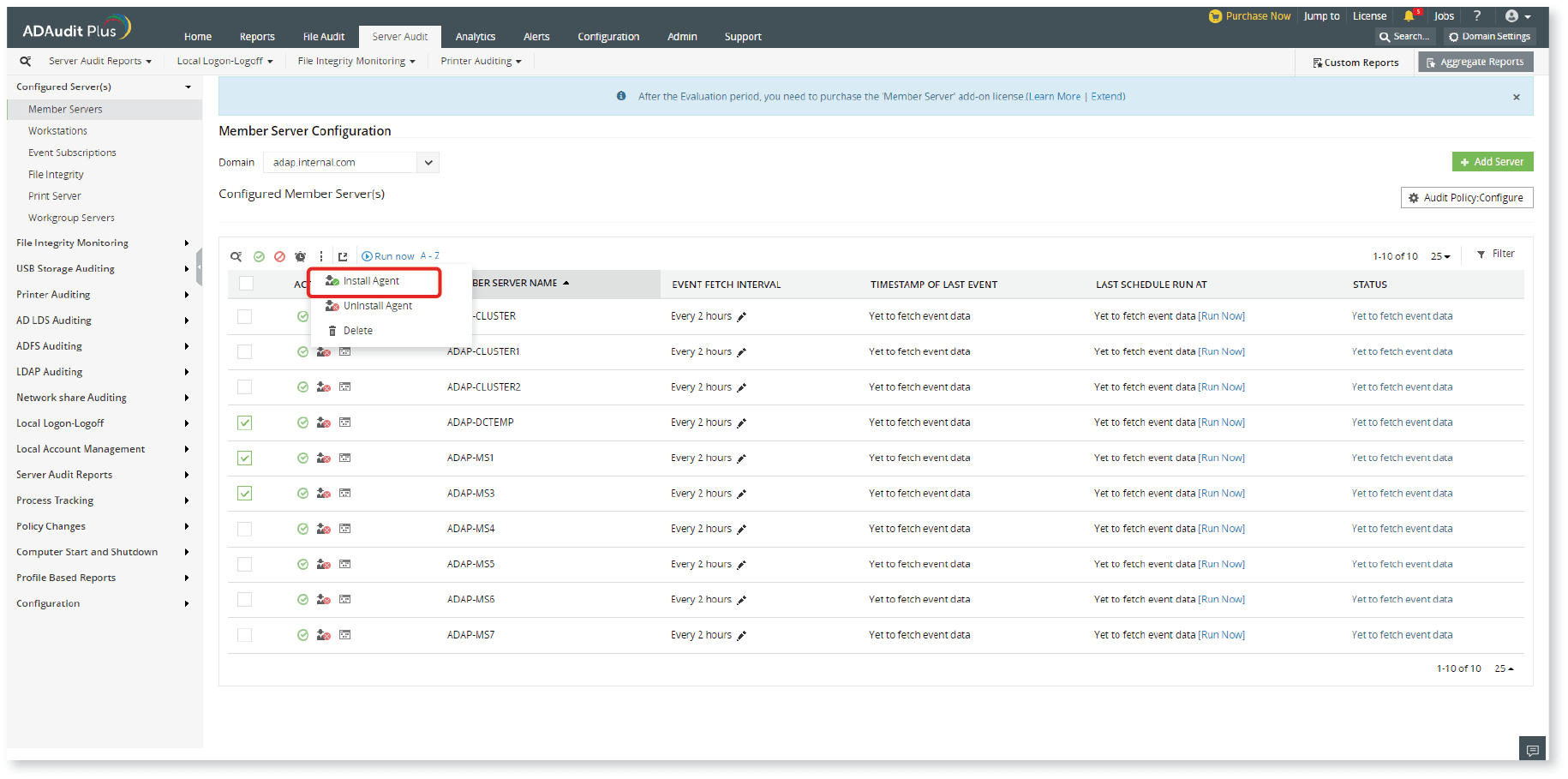 现在,您已经设置好环境,可以满足安装先决条件,然后可以从ADAudit Plus的用户界面中直接在目标计算机上安装代理,如下所示: