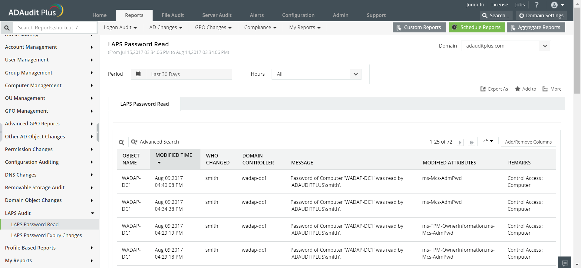 ADAudit Plus的LAPS审核工具提供有关以下方面的信息: