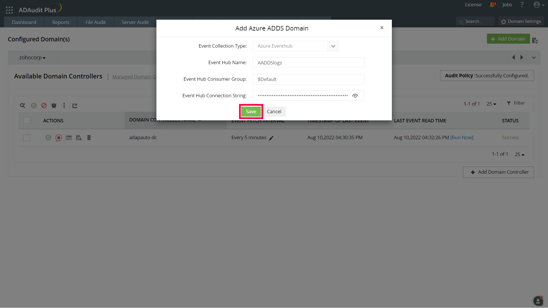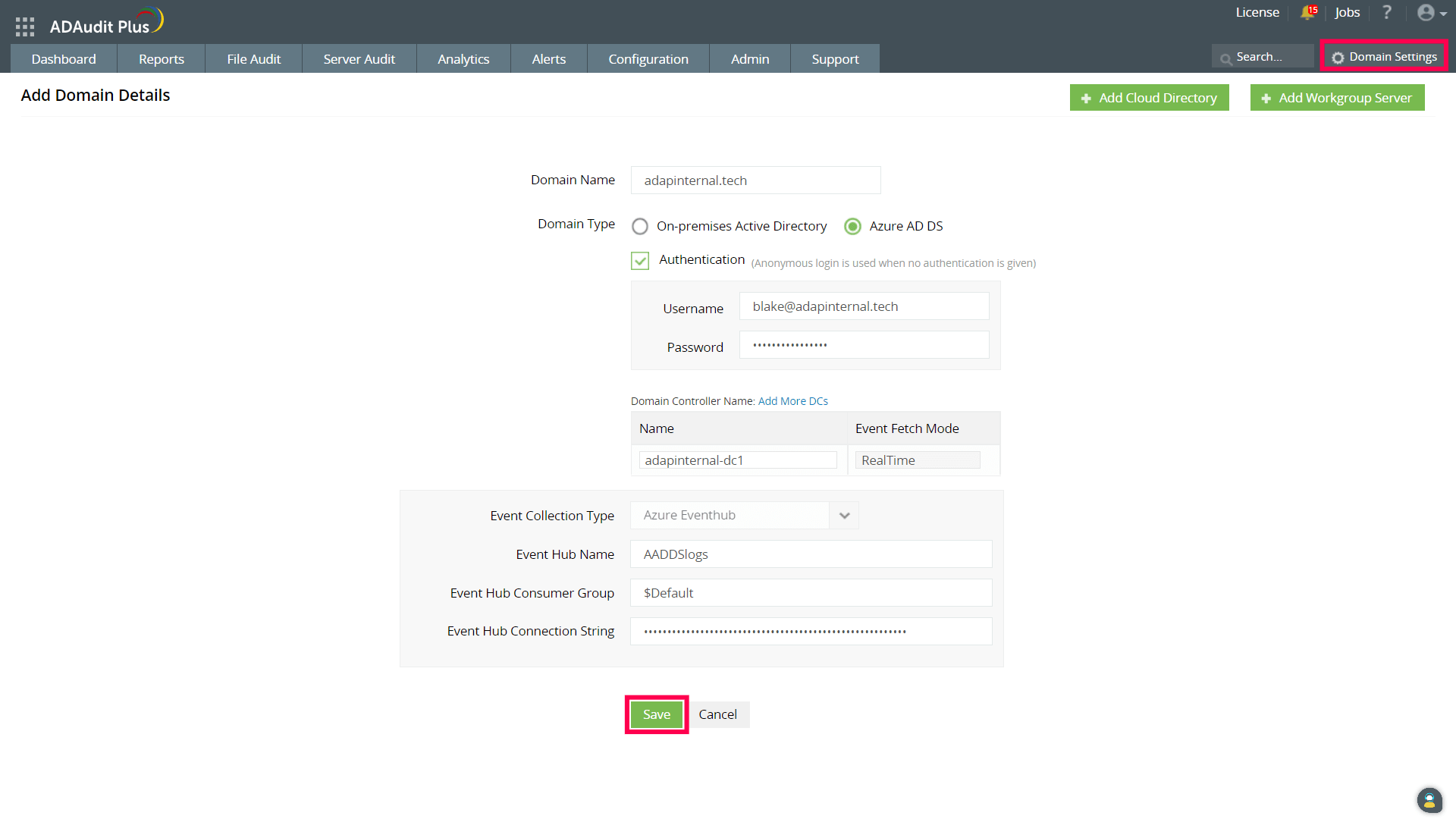 如果已在ADAudit Plus中自动配置Azure AD DS域,请按照以下步骤添加事件中心详细信息: