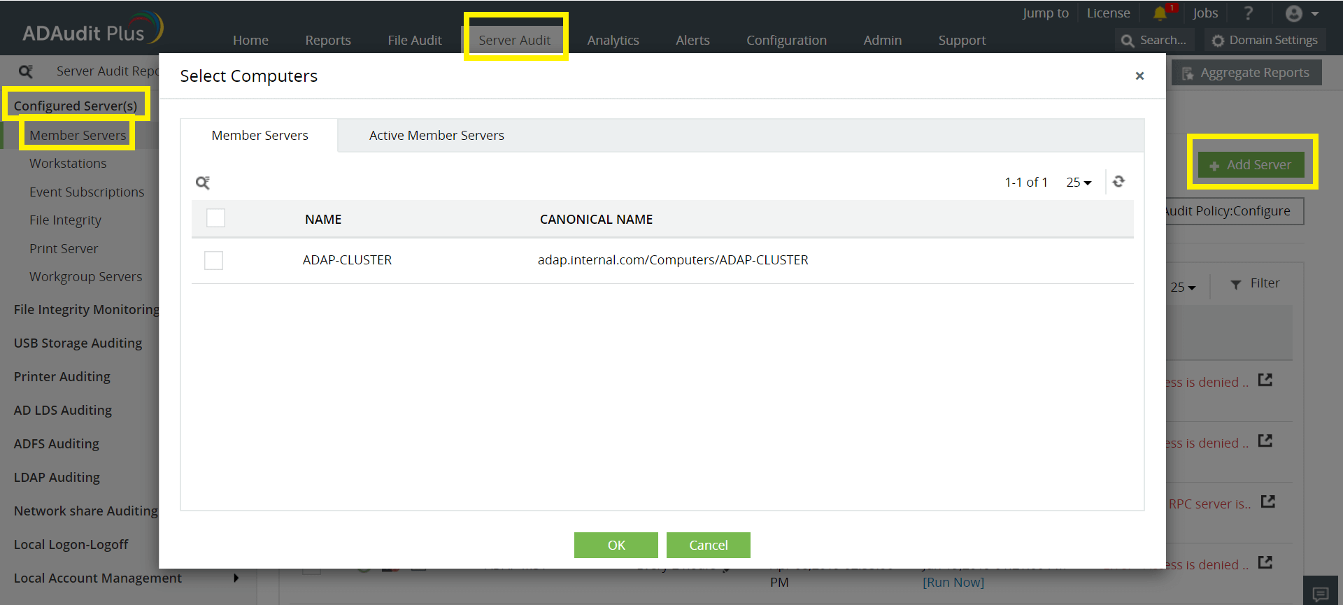 登录到ADAudit Plus Web控制台。转到“服务器审核”选项卡→“已配置的服务器”→“成员服务器”→“添加服务器”。输入完成配置所需的详细信息。