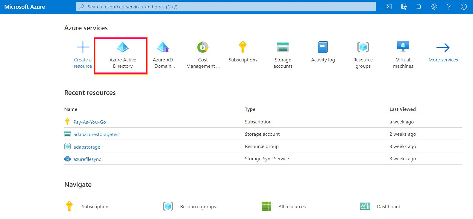 从“Azure 服务”顶部窗格中选择“Azure Active Directory”服务。