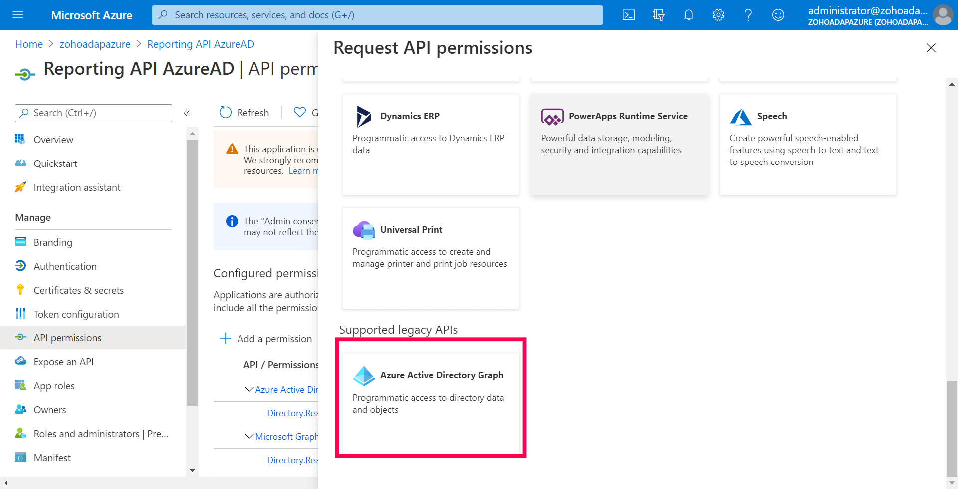 转到“管理> API 权限”,然后选择“+ 添加权限”。