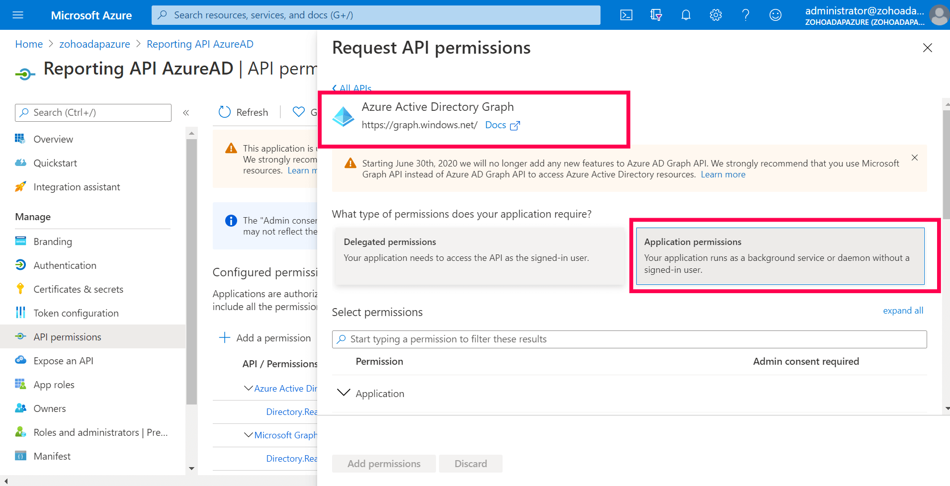 转到 Azure Active Directory Graph >应用程序权限。