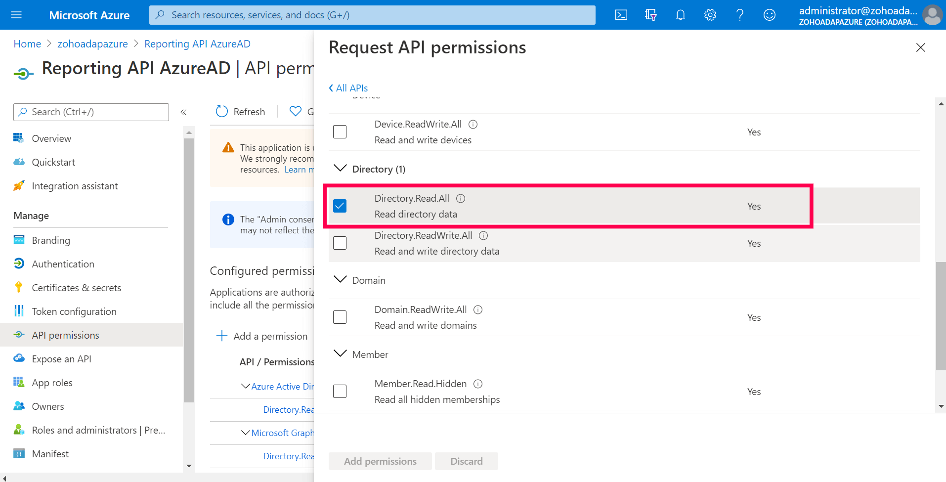 在“请求 API 权限”窗口中,选择“目录”>“Directory.Read.All”。