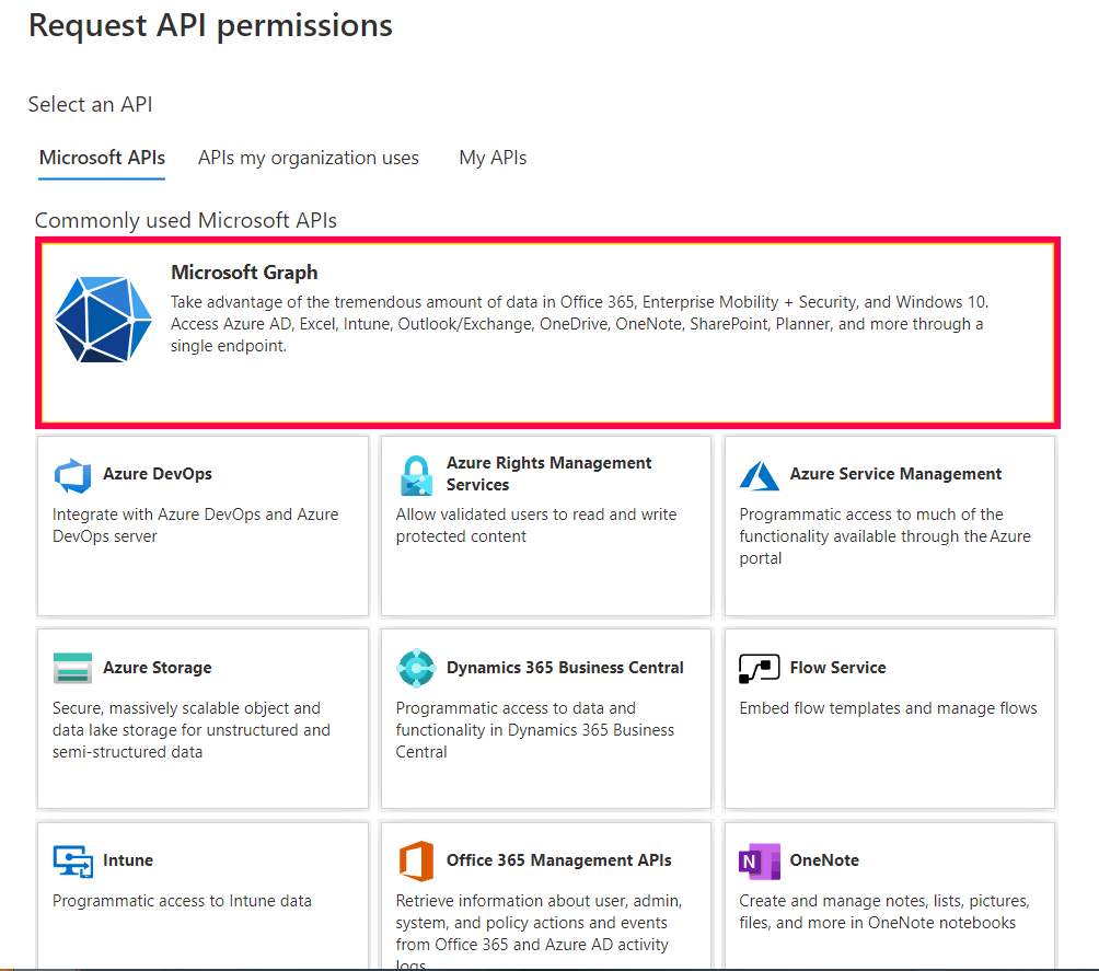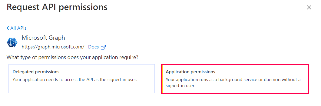 转到选择 API > Microsoft Graph。单击“应用程序权限”作为所需的权限类型。