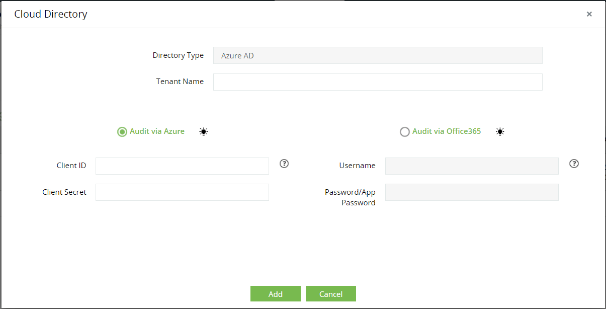 在“Cloud Directory”窗口中,键入“租户名称”、“客户端 ID”和“客户端密码”。
