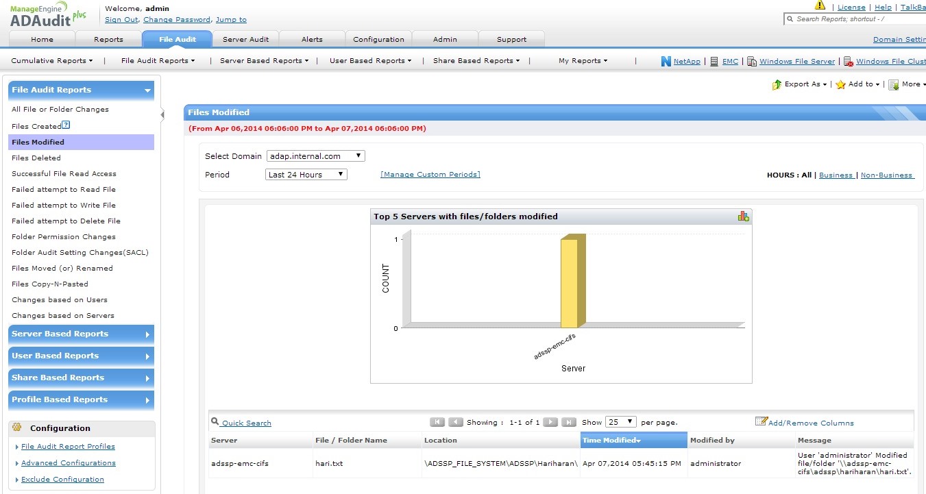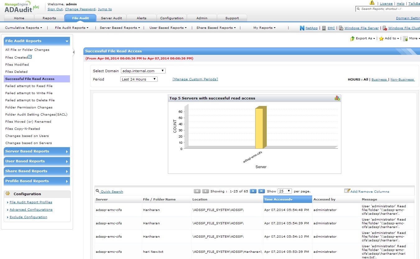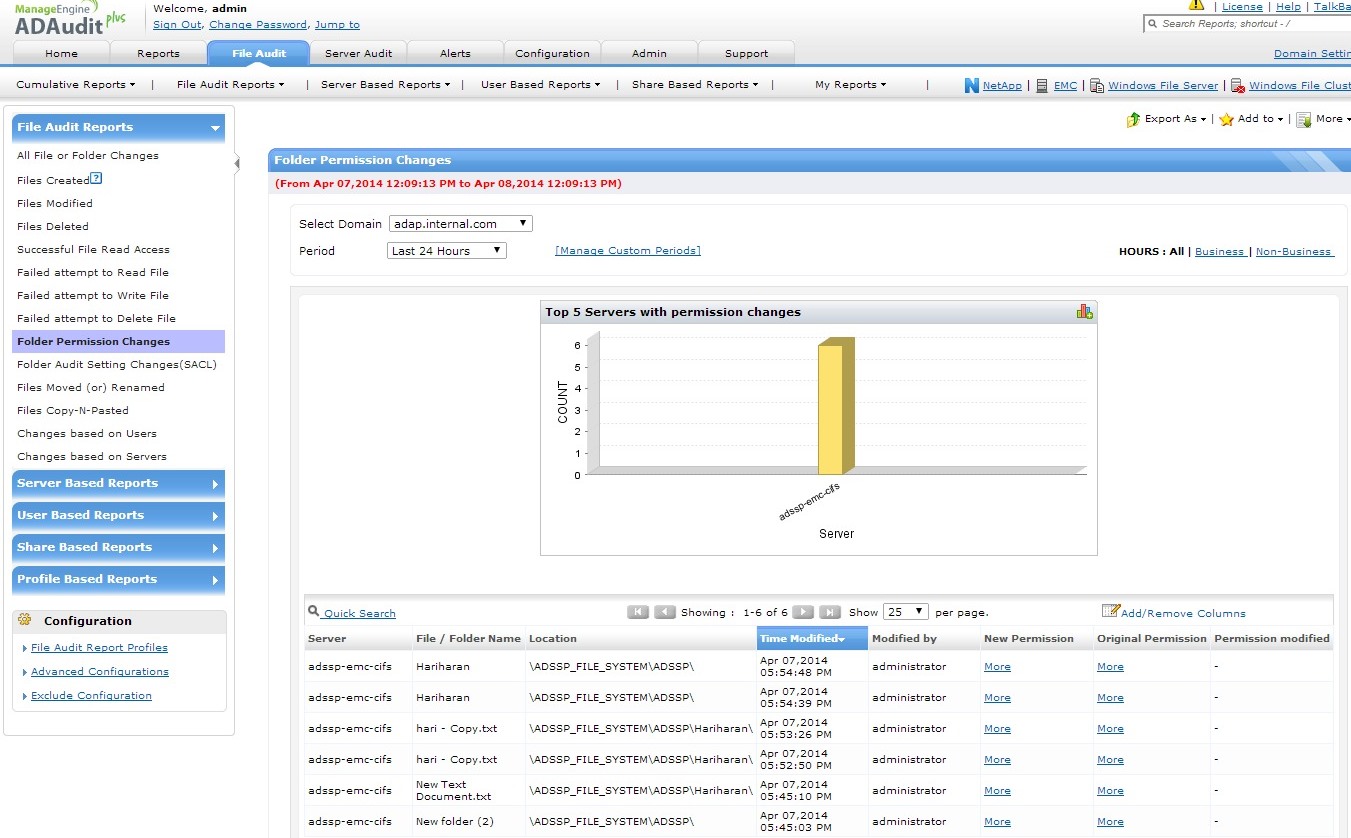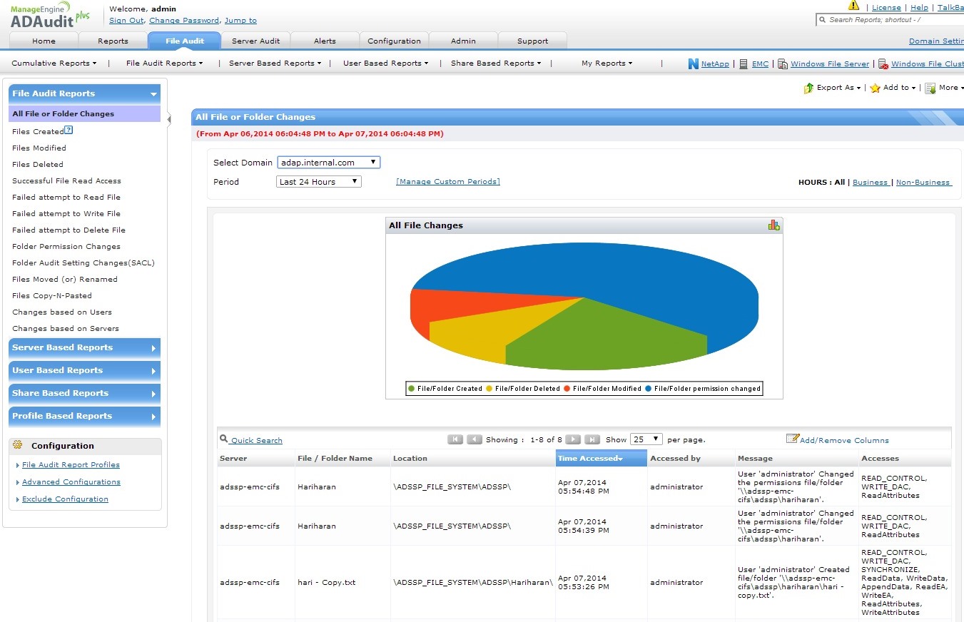 确保您的EMC存储系统获得最高级别的安全,在文件(文件创建/修改/删除)、文件夹访问、共享和权限发生更改时发送即时关键电子邮件告警,对每项更改进行详尽的审核和报表,从而防止未经授权访问。知道是谁在何时从何处作出什么更改。监控EMC存储设备对于存储的保密数据非常重要,记录每次成功和失败的文件/文件夹访问、修改、移动、复制和重命名尝试,以及审核设置和权限更改也非常重要。