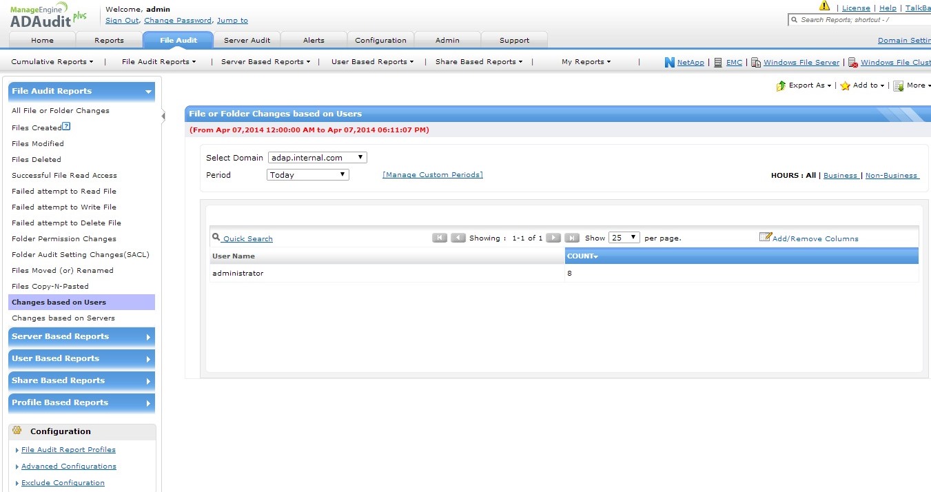 ManageEngine ADAudit Plus是一个基于web的Windows Active Directory、工作站登录/注销、文件服务器和成员服务器更改审核软件。它包含150多个报表和电子邮件告警,可使用户、GPO、组、计算机、组织单位、EMC、NetApp、打印机、USB的更改跟踪自动化,实现组织安全和IT合规。