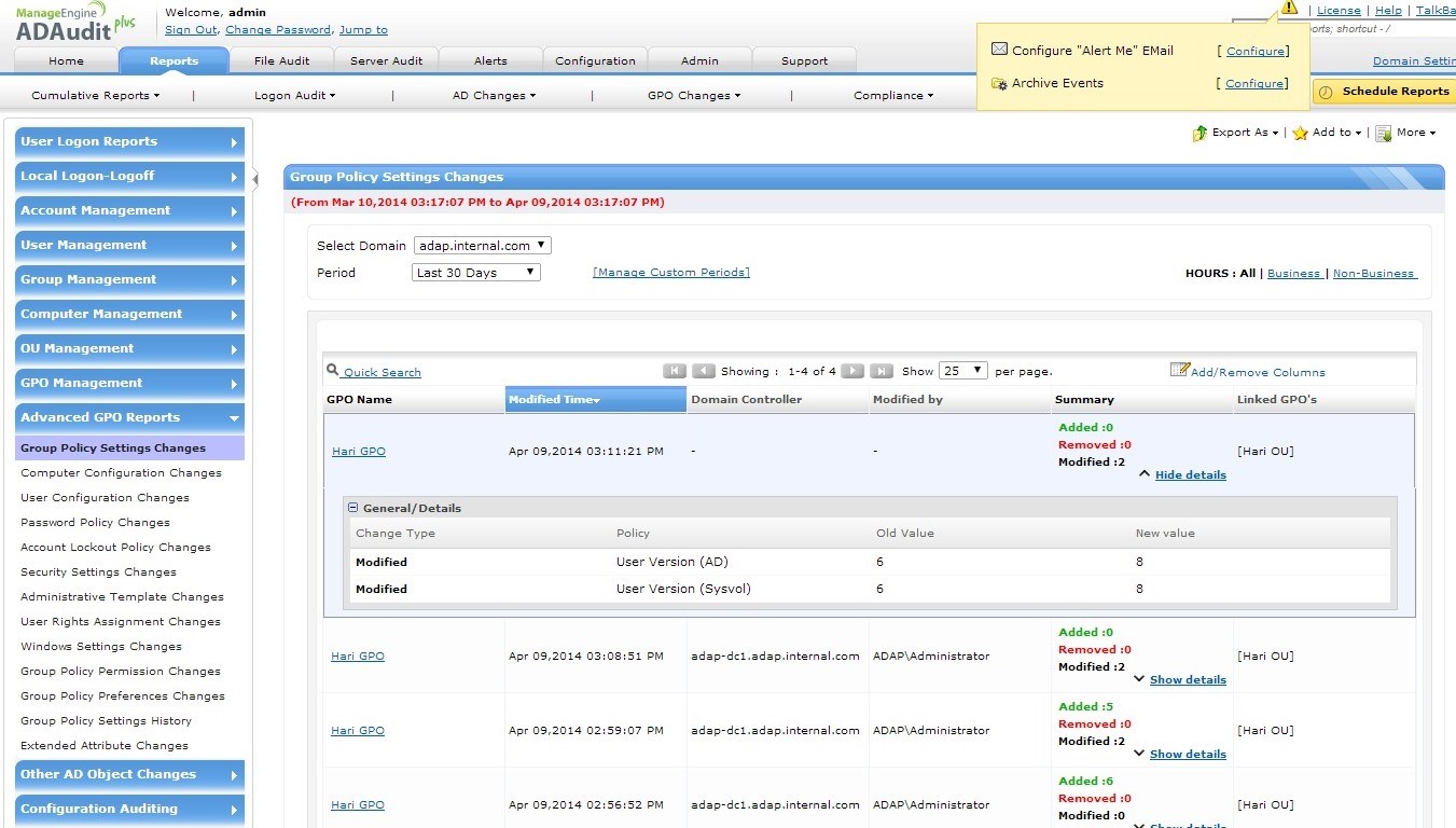 查看和监控每个GPO和各个GPO之间的各种设置变更,整洁地分类到各种易于恢复的的类别中,并且包含变更的详细视图。