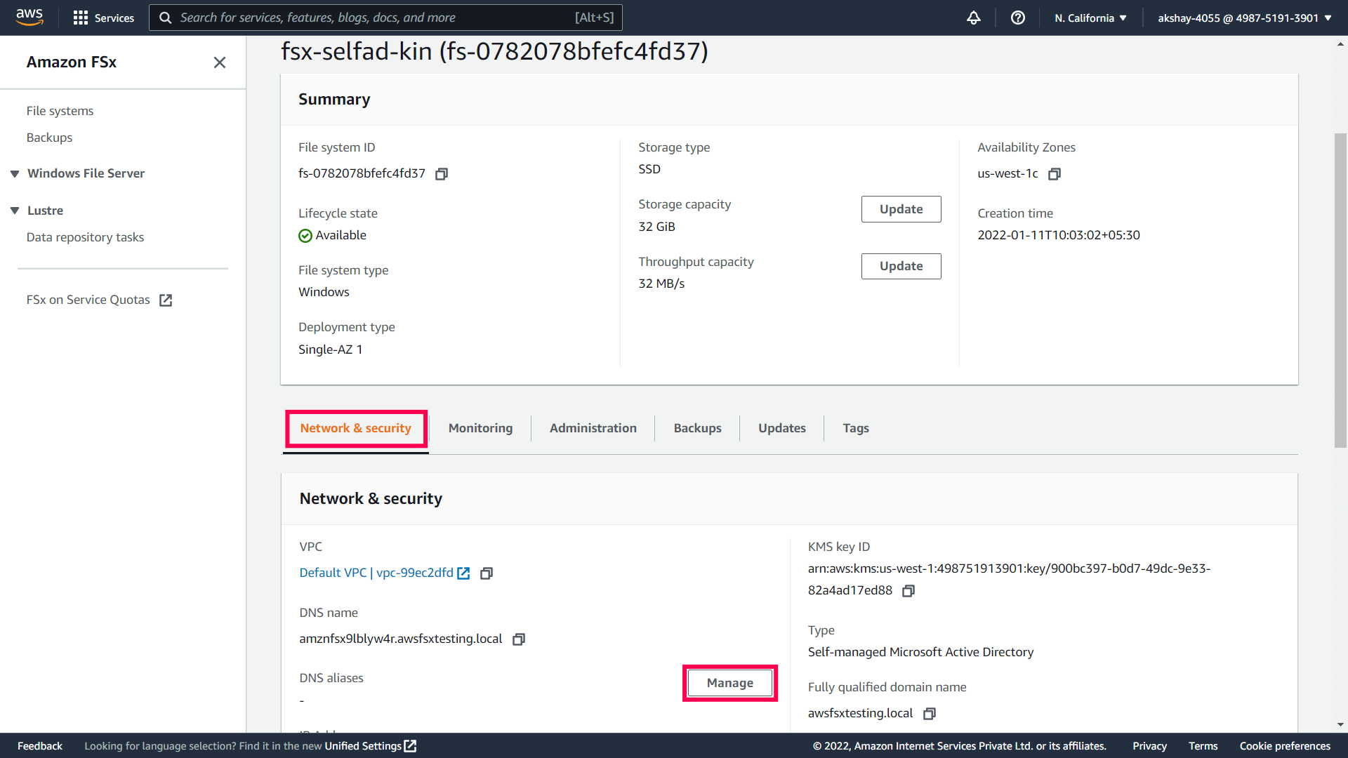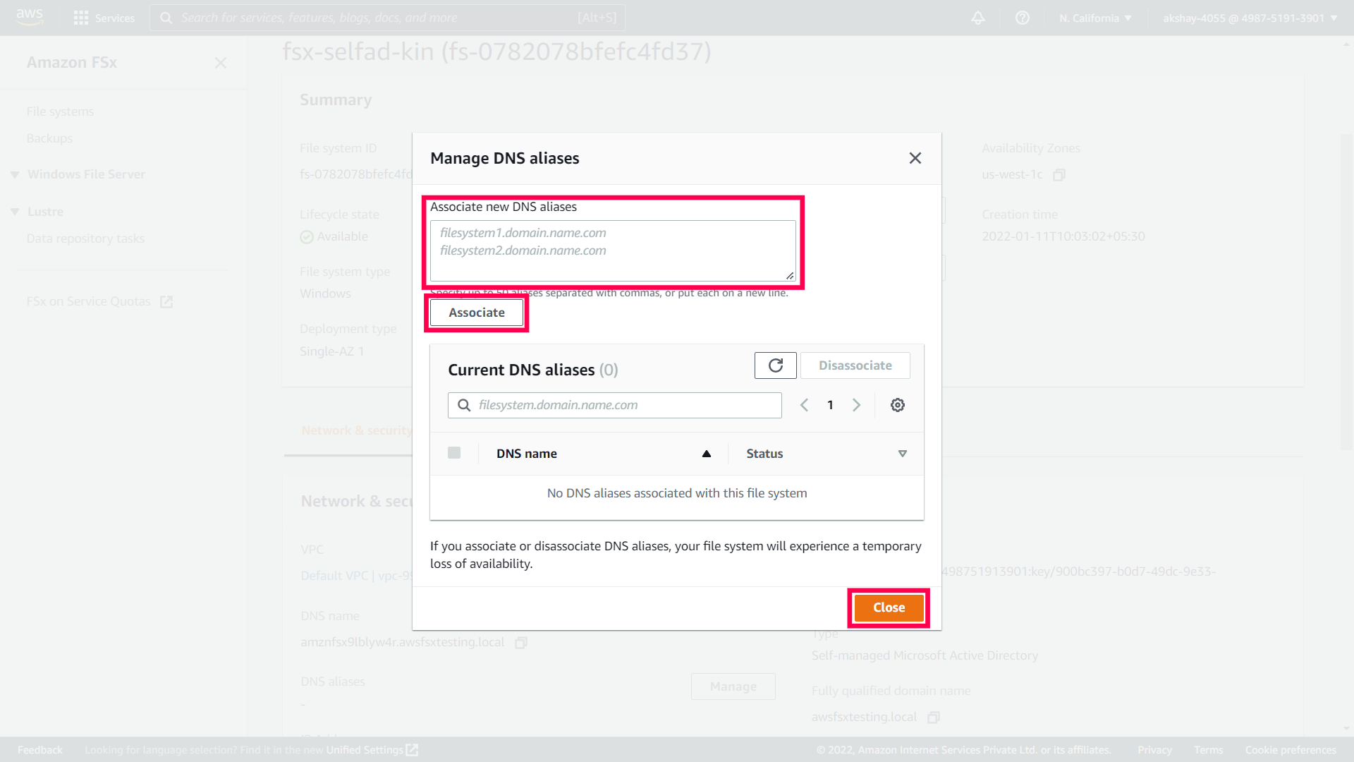 If you are using your Amazon FSx file system with an AWS Managed Microsoft AD, follow these steps to associate DNS aliases with your file system: