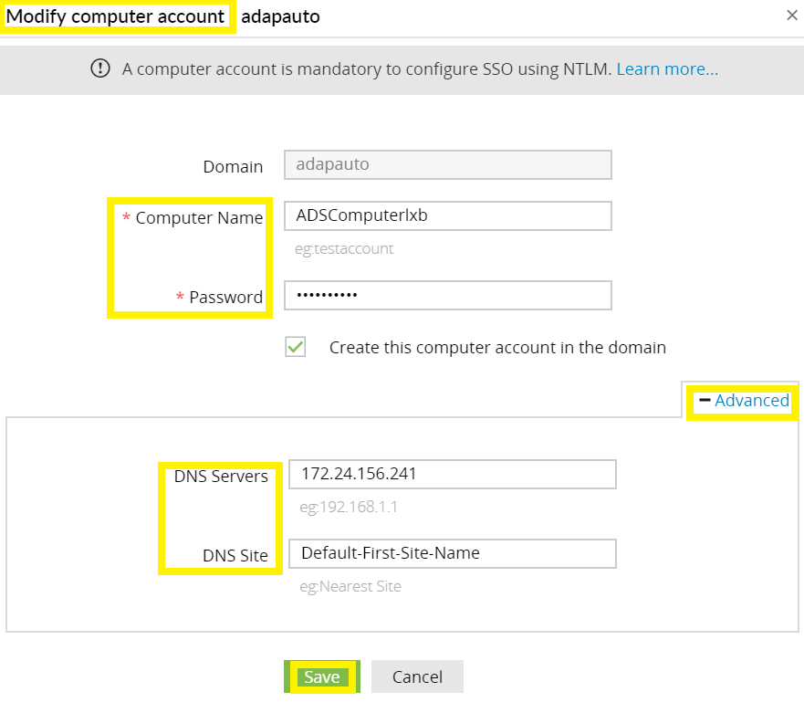 3. Under Advanced, if the DNS Servers and DNS Site are not filled automatically after entering the computer name and password, enter them manually.