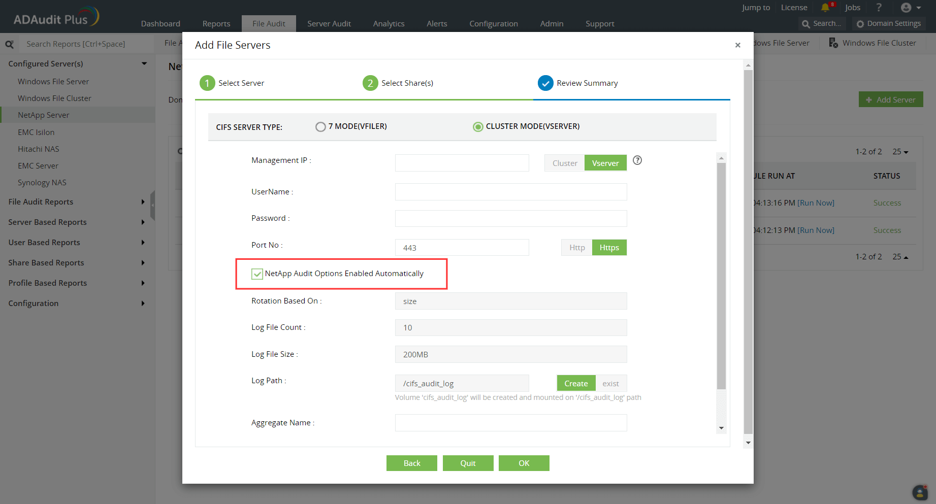 On the Review Summary page of the Add Servers pop-up, you can configure your preferred audit options. Start by choosing your CIFS server type—in this case, Cluster Mode/Vserver.