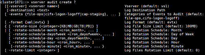 Vserver audit create -<Vserver_Name> -destination <Log_Destination_Path> -format <Log_Format_in_XML/evtx> -rotate-size <Log_File_Size_Limit_in_KB/MB/GB/TB/PB> -rotate-limit <Log_Files_Rotation_Limit>