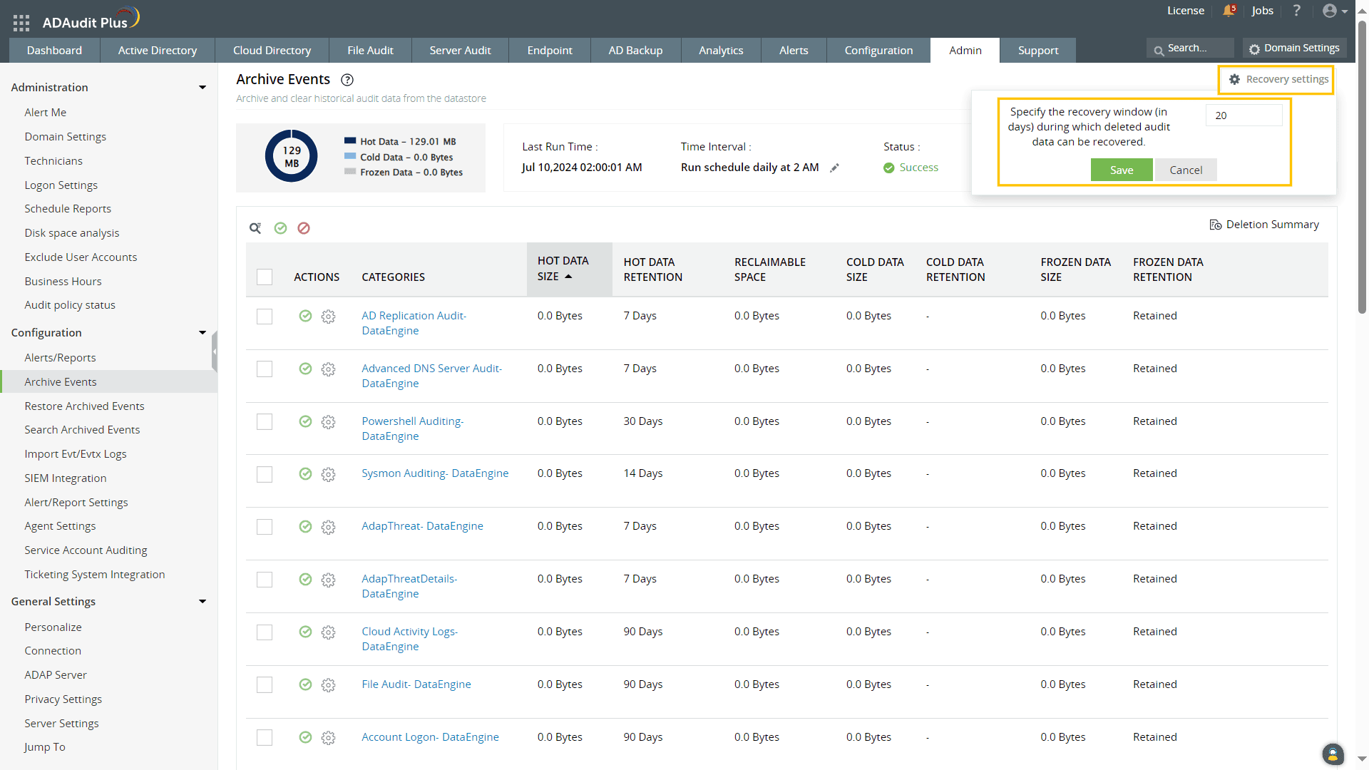 恢复设置使您可以配置恢复窗口,在此窗口期间您可以恢复已删除的审计数据。默认情况下,恢复窗口为20天,最大限制为30天。如果将恢复窗口设置为0天,审计数据将立即删除,无法恢复。