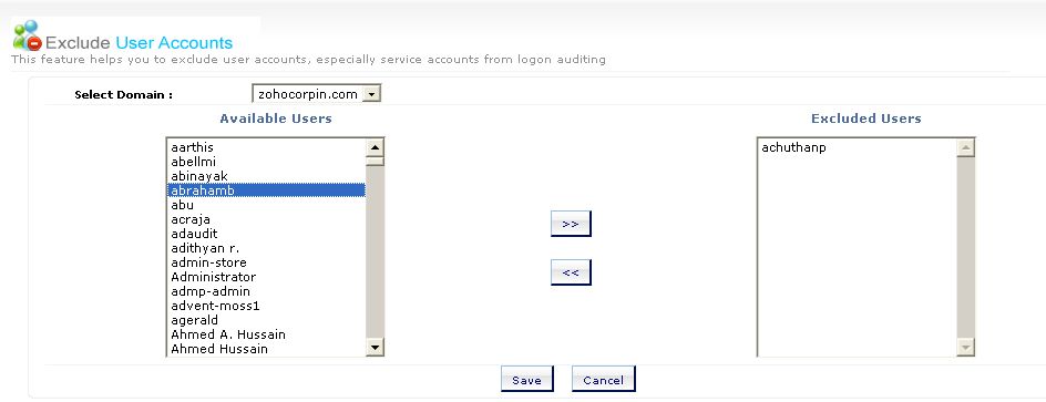 计算机中某些特殊用户(比如:服务帐户)可能需要频繁地登录,因而会产生大量的登录日志数据,对这样帐户的数据进行审核,不仅消耗了大量的数据库,带来性能的下降,而且实践证明对这类帐户的告警也没有太大的实际意义。 因此,如果能够排除一些不想要审核的用户帐户,将会使审核更具实际价值。为此,特别在ADAP中增加了"除外用户帐户"的功能。
