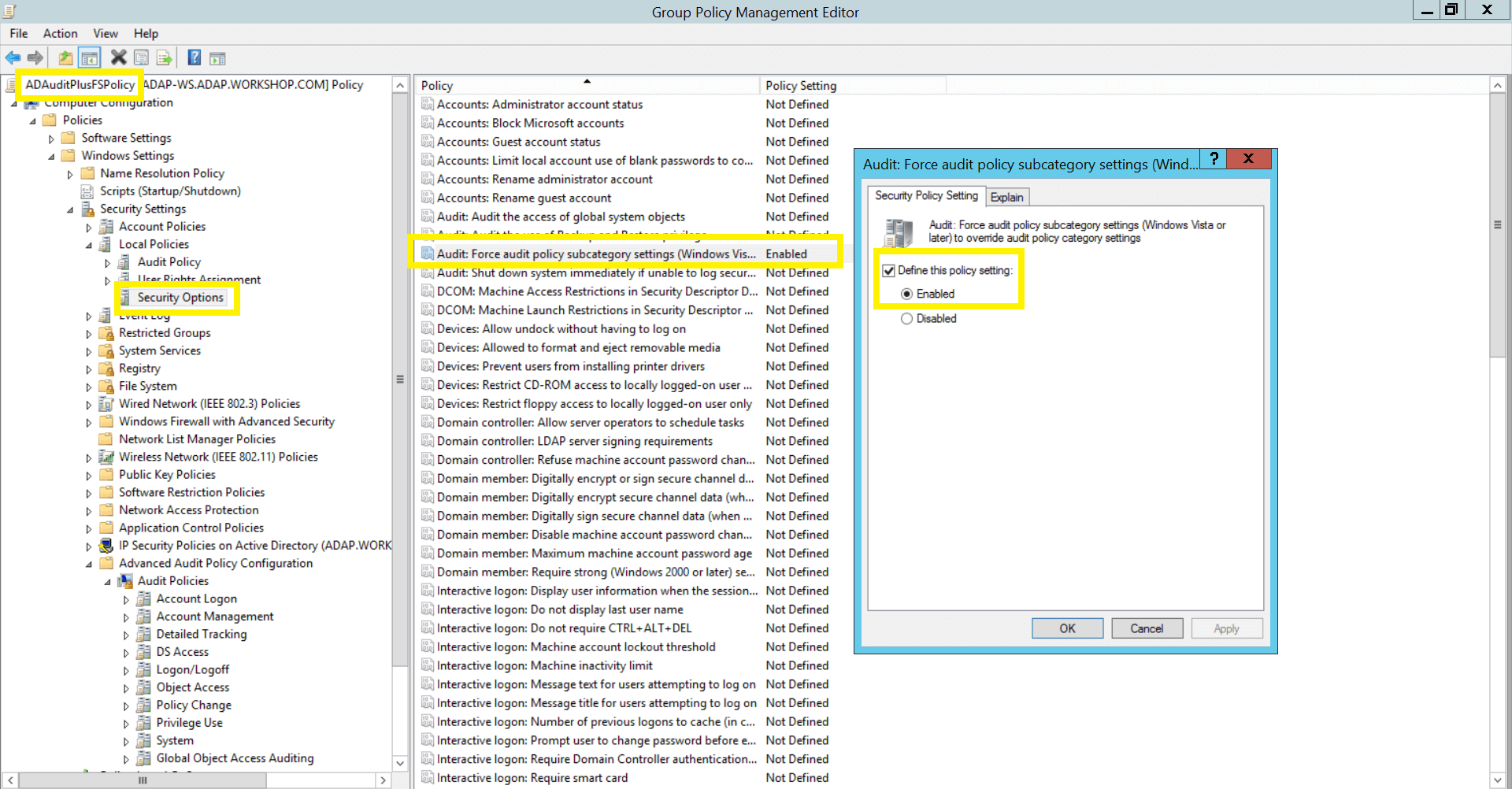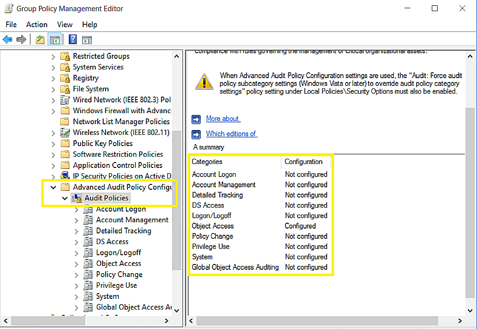 高级审核策略帮助管理员对记录在日志中的活动进行细致控制,减少事件噪声。我们建议在 Windows Server 2008 及以上版本中配置高级审核策略。