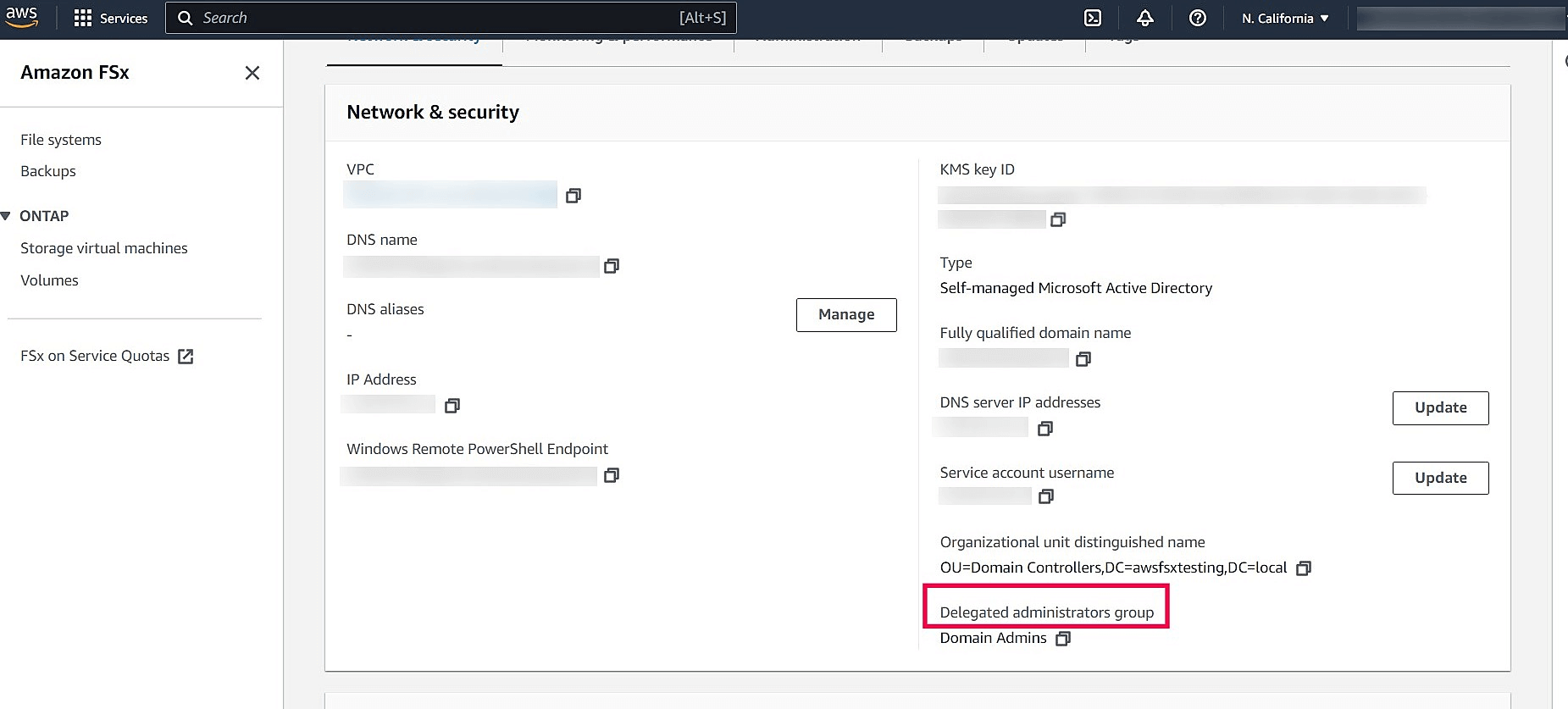 - 将用户直接添加到 Amazon FSx 控制台中所示特定文件系统的 委派管理员组。