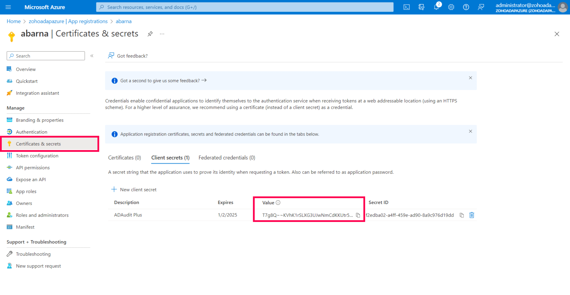 客户端密码值仅在生成时可用。因此,如果您在其他地方复制了当前客户端密码的副本,您可以将其与 ADAudit Plus 中配置的值进行比较。如果没有,您需要创建一个新的客户端密码。