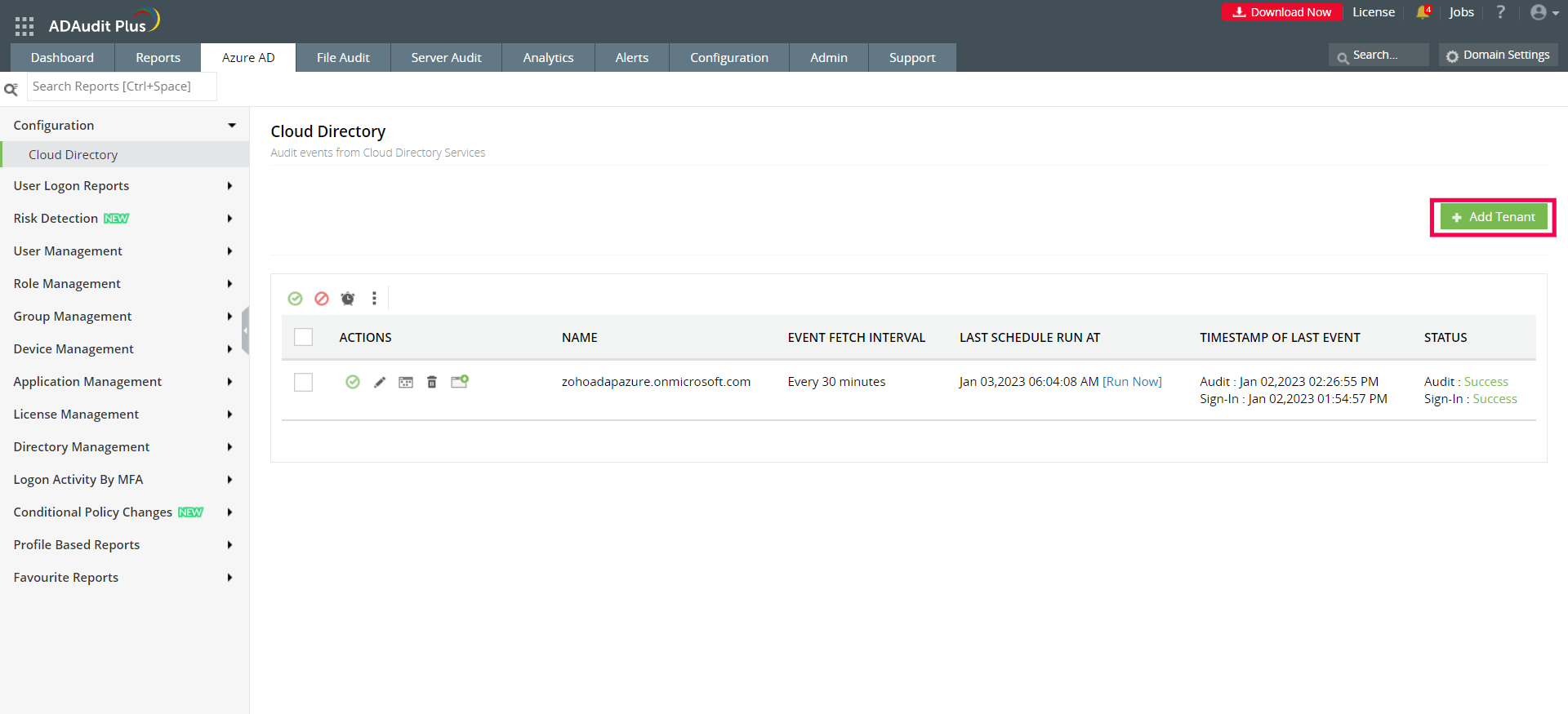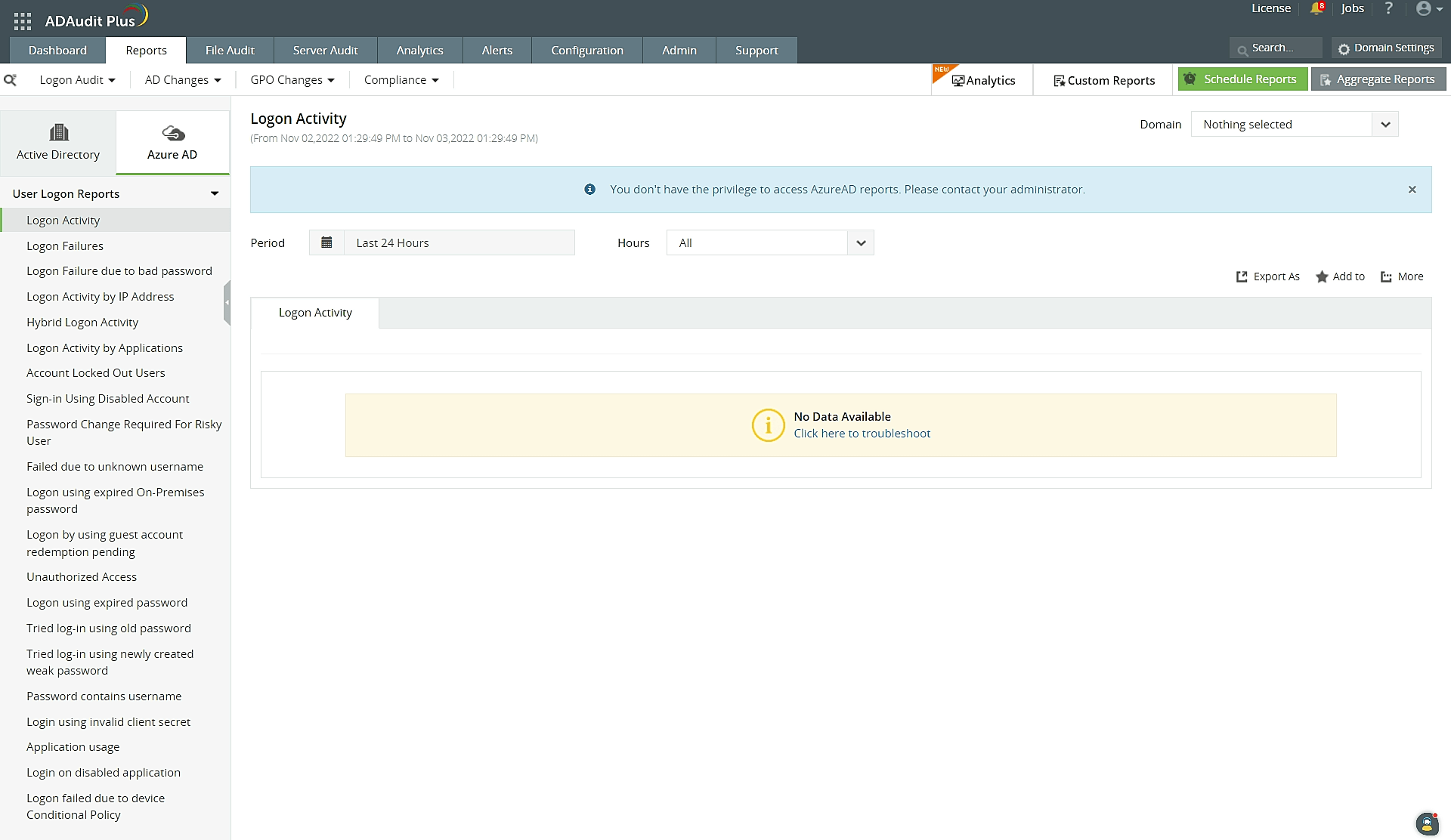 解决方案: 此问题可能源于多个因素。其中之一是权限不足,即用于登录到 ADAudit Plus 的帐户没有审计 Azure 所需的权限。在这种情况下,产品内将会有如下面截图所示的通知。