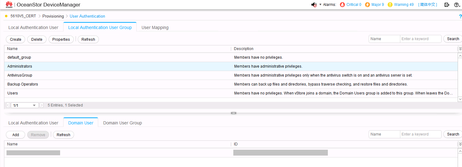 - 在 OceanStor DeviceManager 中,配置域认证服务器以为域用户提供管理权限。