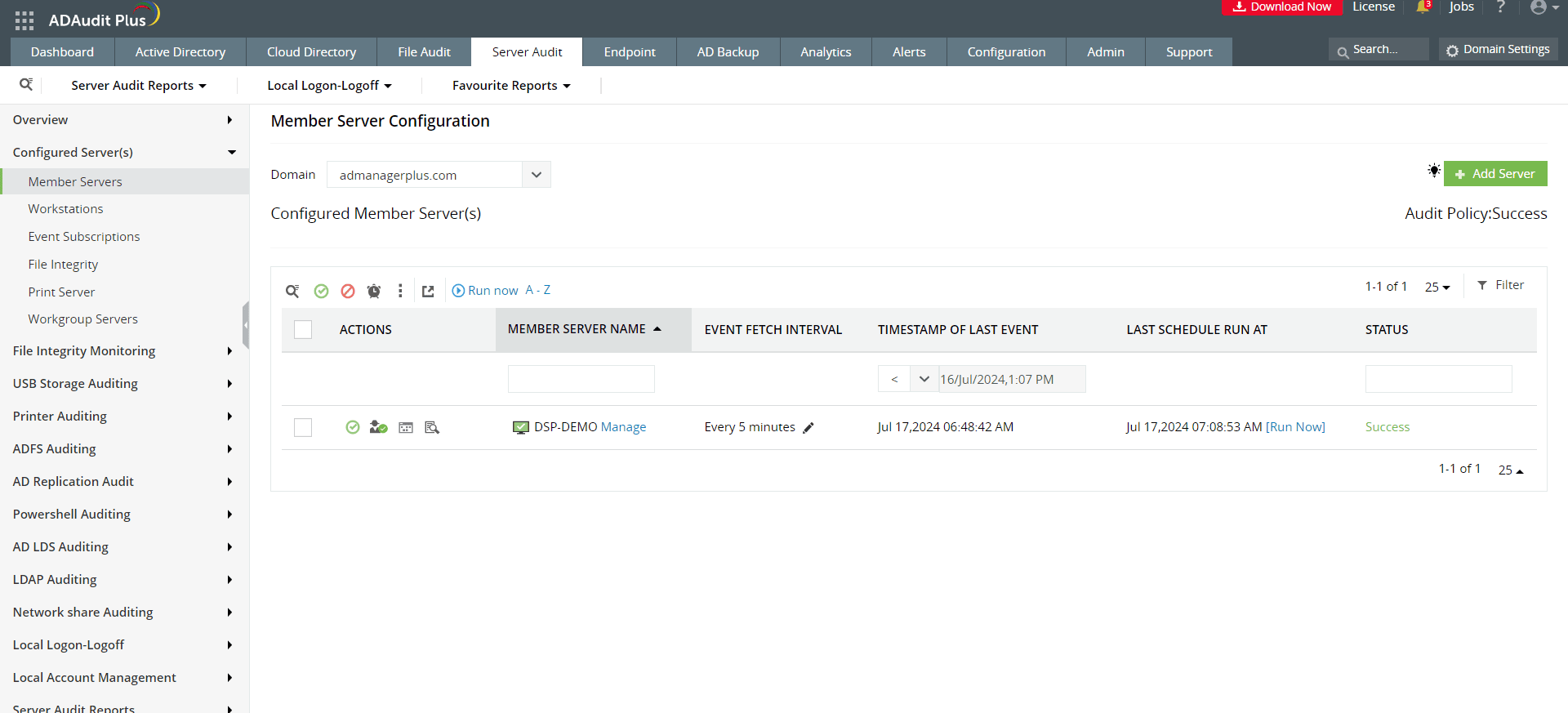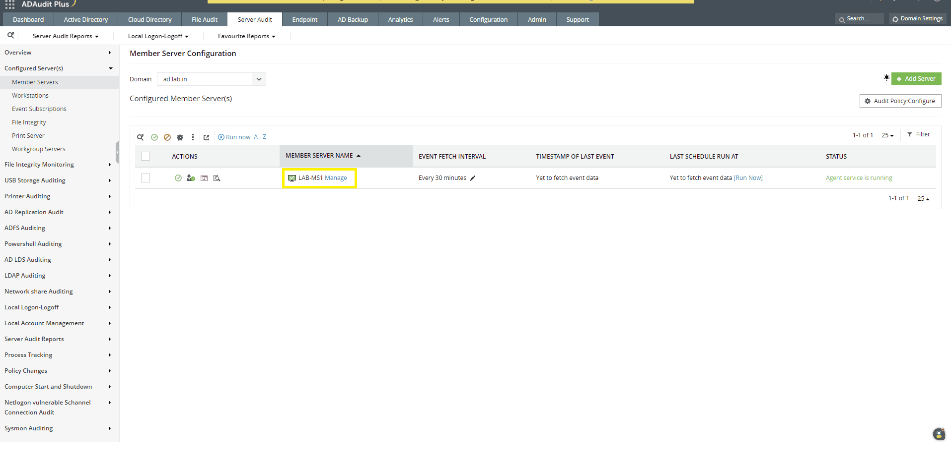 其中,服务器名称 指的是承载 ADAudit Plus/NAT 设备的服务器名称。
