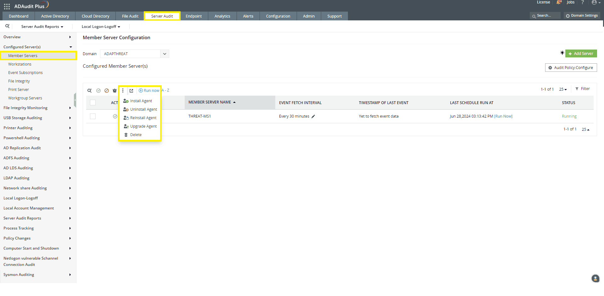现在您已经设置好环境以满足安装前提条件,您可以直接通过 ADAudit Plus 的用户界面在目标机器上安装代理,如下所示: