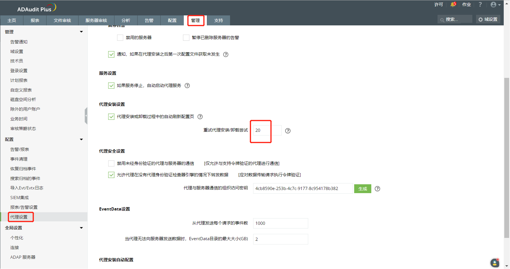 • 如果代理安装/卸载失败,可以重试,最大重试次数可以从产品管理页面下的代理设置选项卡中配置。