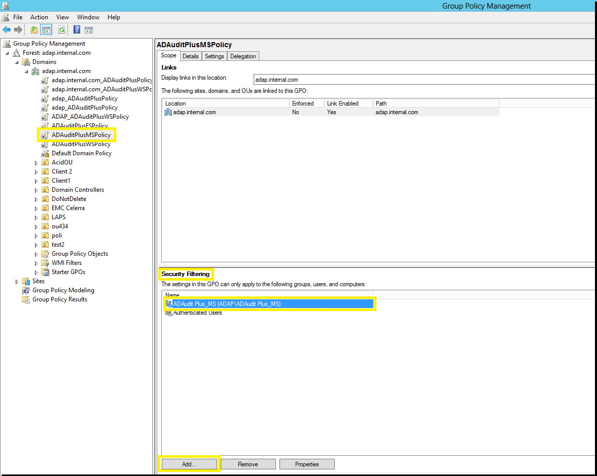 - 将上面的组“ADAuditPlusMS “添加到“ADAuditPlusMSPolicy”中的“安全筛选”内。