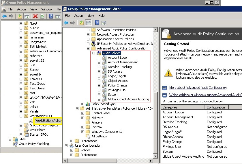 对于Windows 2008R2、Windows 7 及以上的系统,要获取工作站的审核报表,还必须配置高级审核策略。