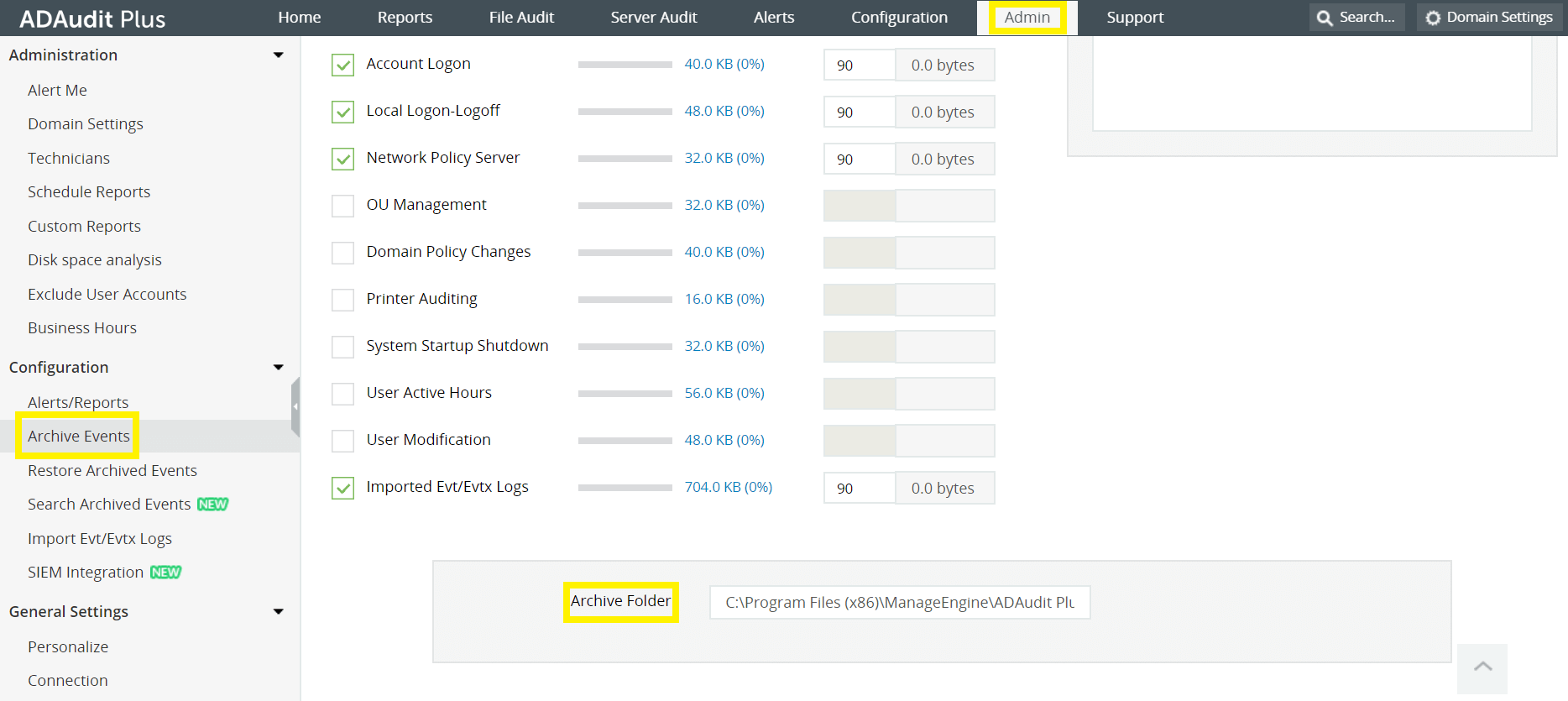• 要找到归档文件夹的位置: 打开 ADAudit Plus → 管理 → 归档事件 → 向下滚动以查看位置。