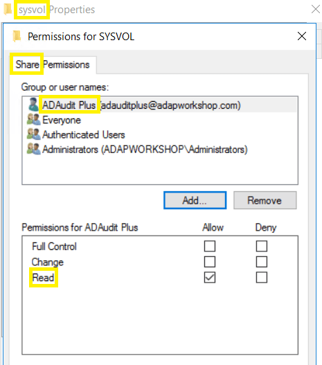 导航到 sysvol 文件夹 (C:\Windows\SYSVOL\sysvol) → 右键单击 → 属性 → 共享 → 高级共享 → 权限 → 添加 "ADAudit Plus" 用户 → 提供共享读取权限。