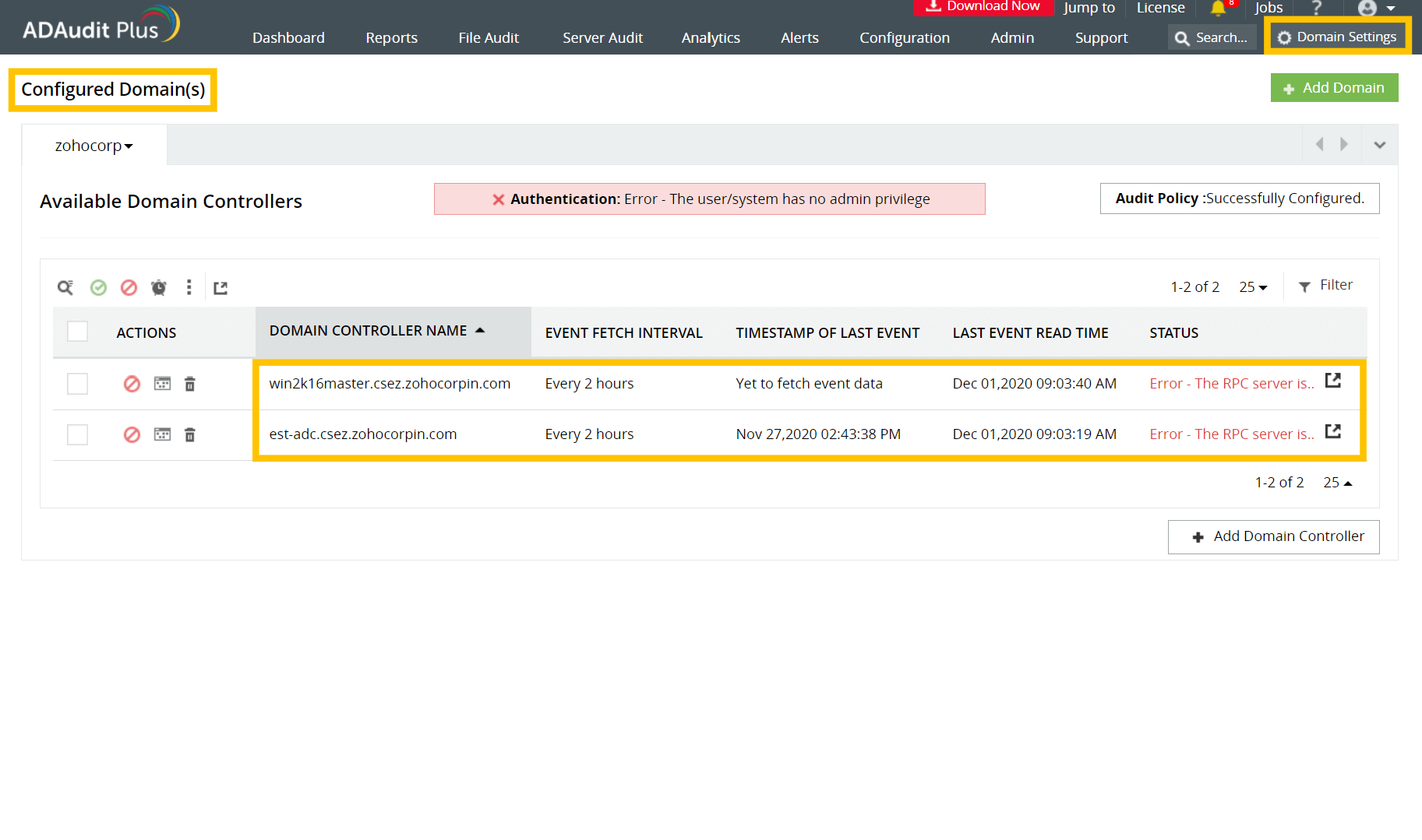 • 识别在 域设置 下的 可用域控制器 或在文件审计选项卡下的 已配置服务器 中显示RPC错误的服务器,或在服务器审计选项卡下的已配置服务器中。