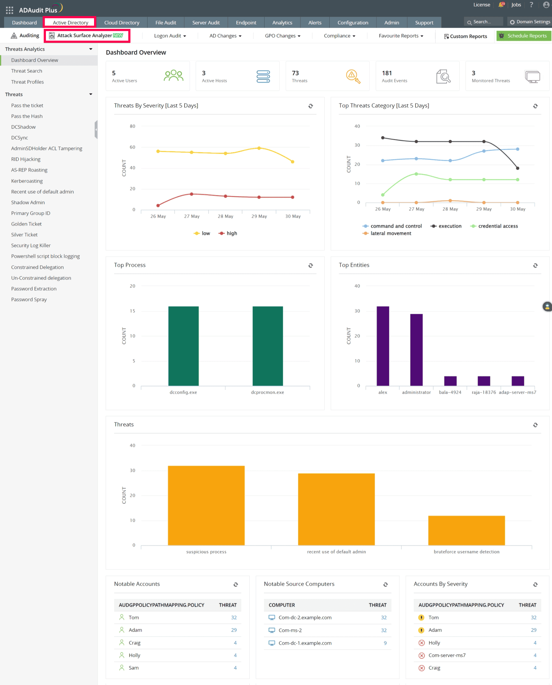 AD的攻击面分析器配备了超过25个独特报表,帮助您发现各种AD攻击。在ADAudit Plus中配置审计的所有AD域会自动添加到攻击面分析中。