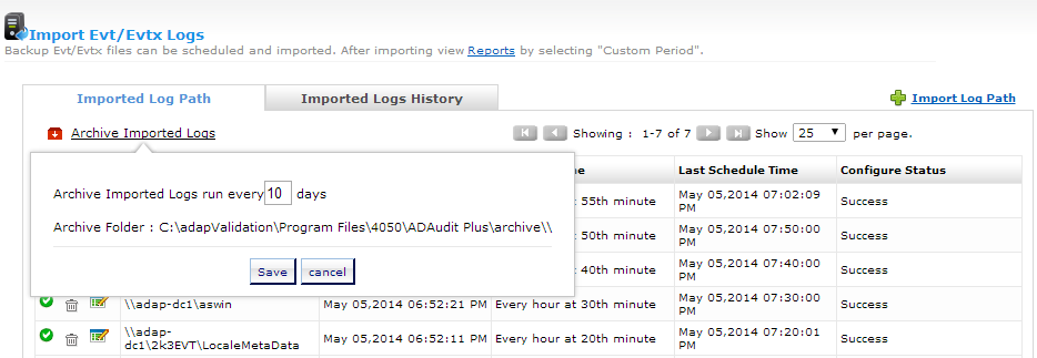 ADAP支持导入事件日志(Evt / Evtx文件)。可以一次性导入日志,也可以设置计划表。定期从共享的文件夹中导入事件日志(Windows Vista, 2008及以上的系统支持.evtx 类型的文件),事件日志导出成功之后,就可以在报表中查看相应的审核数据。您还可以定期地将导入的日志数据进行归档。