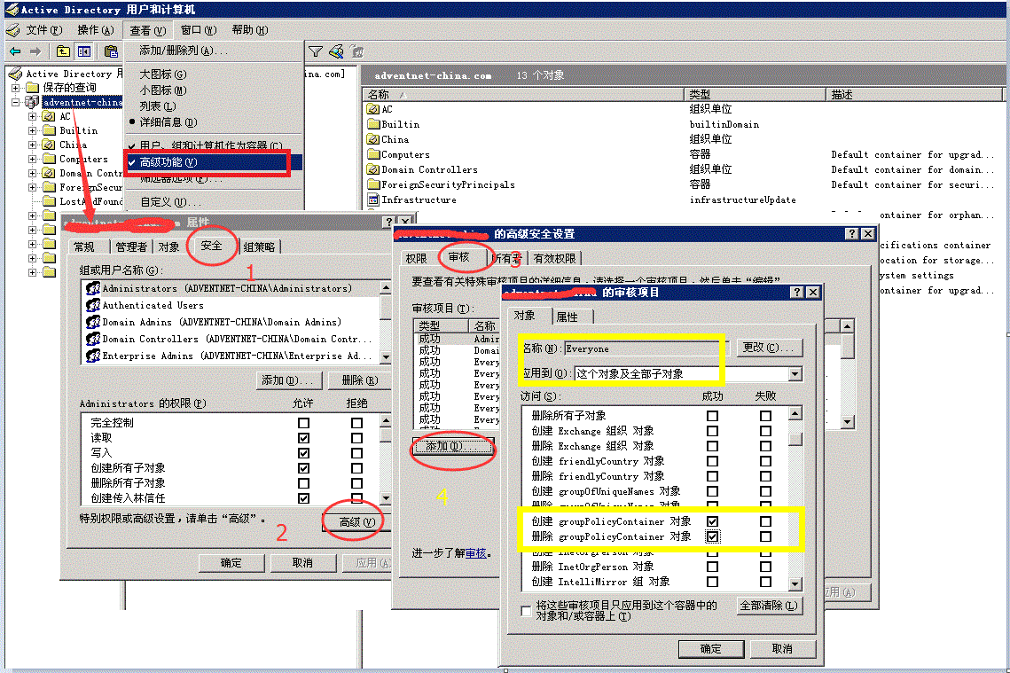 确保查看菜单下的 -> "高级功能" 已被选中。它将显示AD对象的高级安全设置。