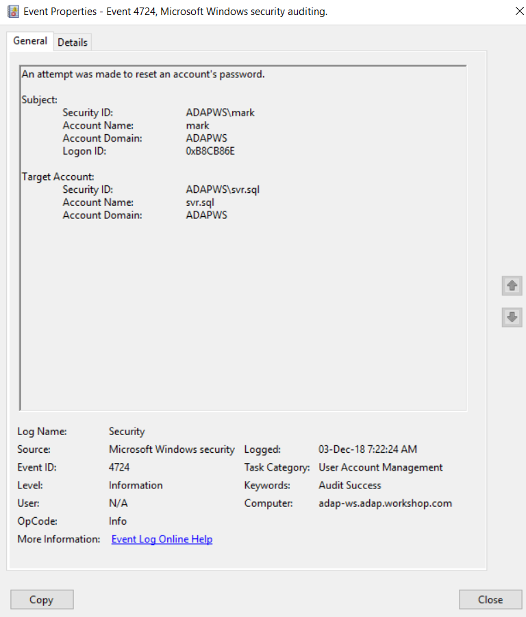 Event ID 4724 is generated every time an account attempts to reset the password for another account (both user and computer accounts).