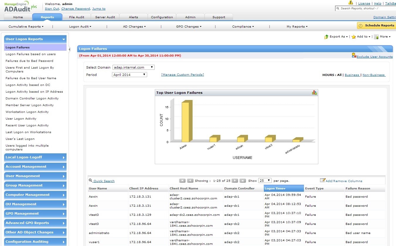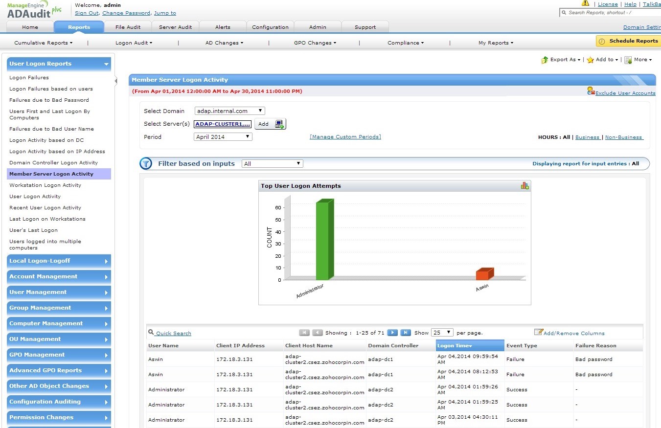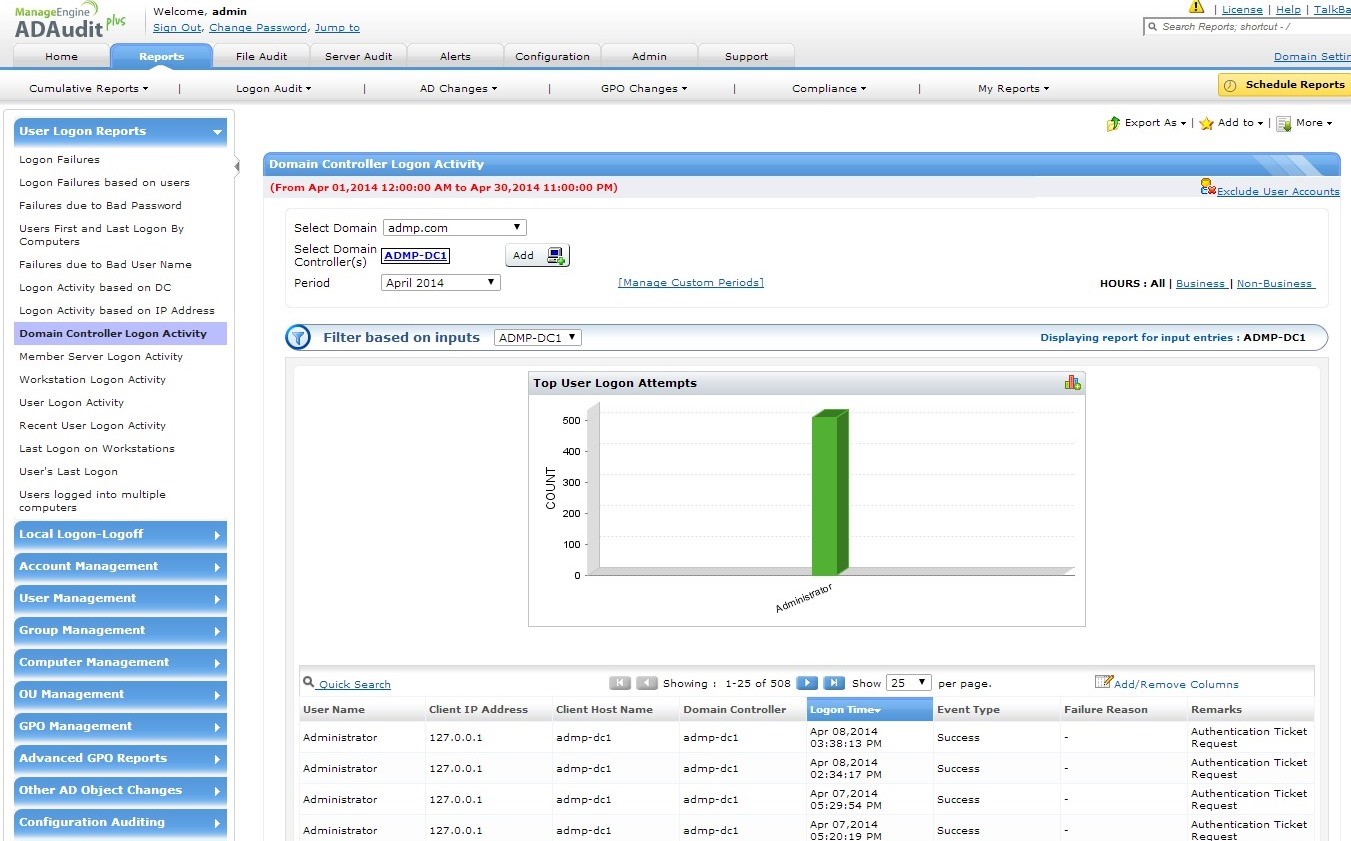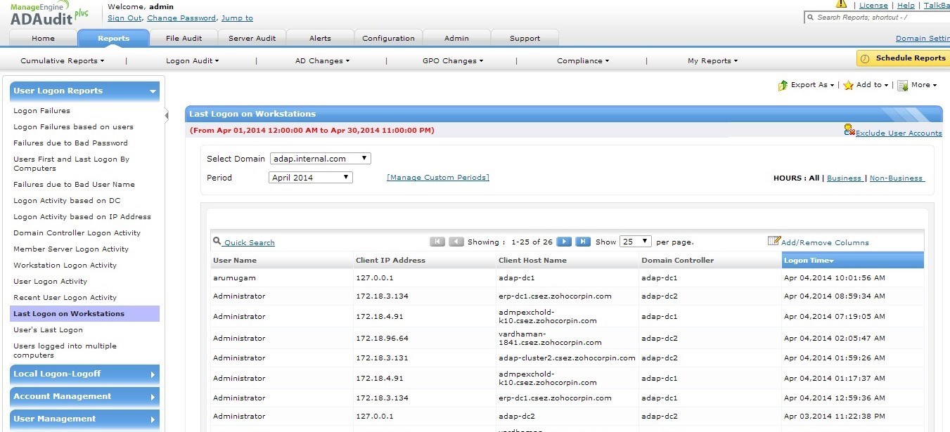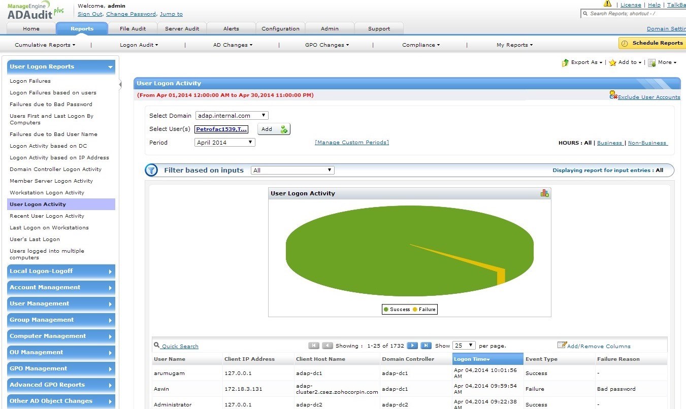 ADAudit Plus提供有关登录失败、域控制器登录活动、成员服务器登录活动、工作站登录活动、用户登录活动、最近用户登录活动以及最后一次登录工作站等方面情况的用户登录报表。此外,该登录审核解决方案也是一个不可或缺的工具,使得特定登录事件、当前和过去登录活动的审核变得容易,并可列出所有与登录相关的变化。它通过易于理解的Web界面来实现,并通过图表、图形以及内置自定义报表的列表视图来显示统计信息。
