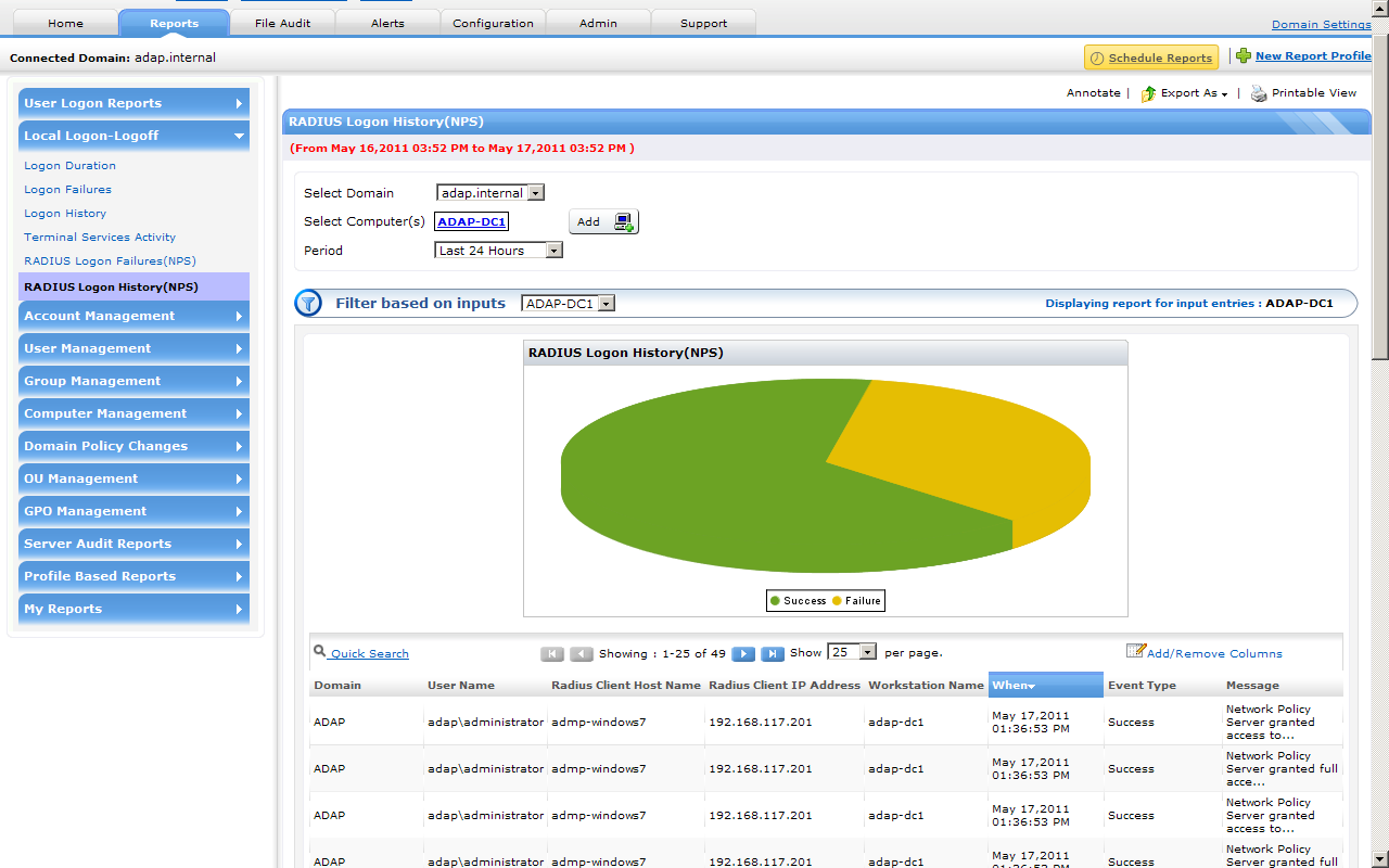 审核已登录到远程计算机的用户的远程认证拨号用户服务(RADIUS)网络访问权。利用远程登录用户报表(例如RADIUS登录失败(NPS)和RADIUS登录历史(NPS)),监控Active Directory中的所有RADIUS身份验证。请注意,目前仅支持经由网络策略服务器(Windows Server 2008)的RADIUS登录活动。