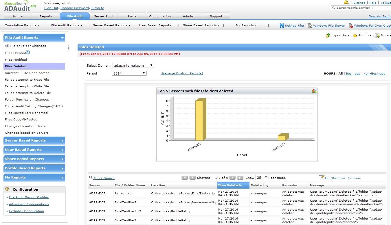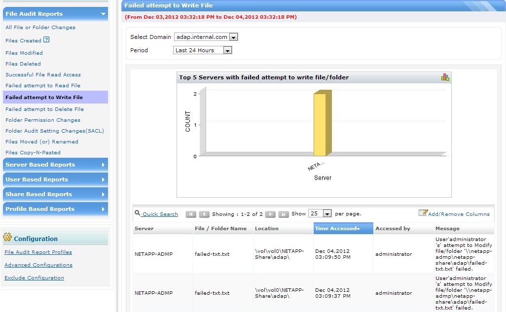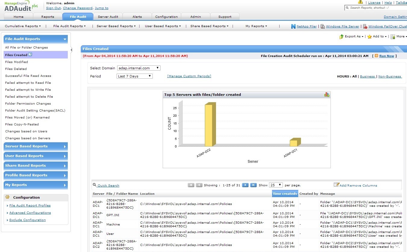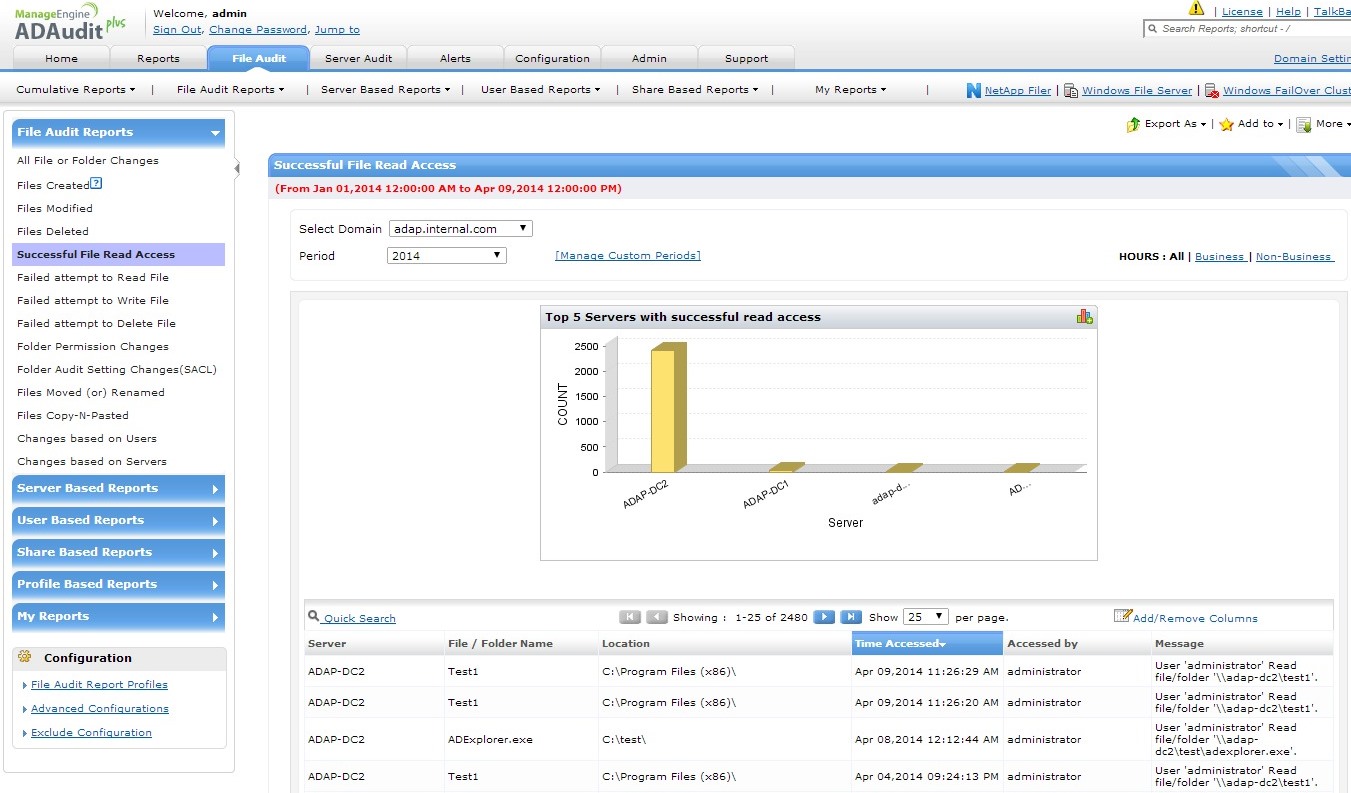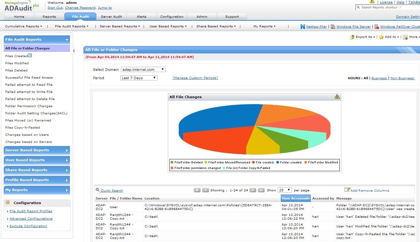 ADAudit Plus帮助您在中央位置实时审核、监控和报表NetApp Filer CIFS共享更改。ADAudit Plus可在Windows和NetApp Filer CIFS文件/文件夹被创建、修改和删除、更改权限等时产生报表和告警。管理员可轻松监控和查看预配置的报表和计划报表与即时告警通知,可在出现网络安全隐患时以及为关键对象访问设置告警通知。告警包含详尽的事件分析,可帮助快速评估状况,以便更好地处理。ADAudit Plus还可利用数据归档功能生成历史记录报表,从而让组织能够满足安全和IT合规需求。此外,报表也可导出为XLS、HTML、PDF和CSV格式,以便在审核过程提交报表。
