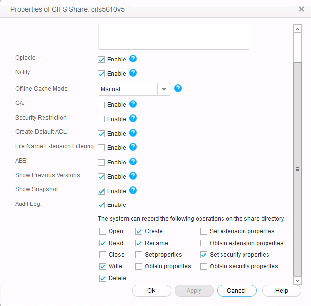 Enable Audit Log and select the access events that you wish to audit in the target shares. You can choose to audit any of the following events: Read, Create, Rename, Write, Delete, and Set security properties.