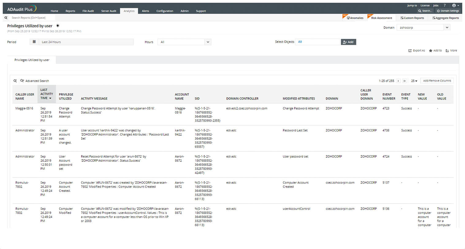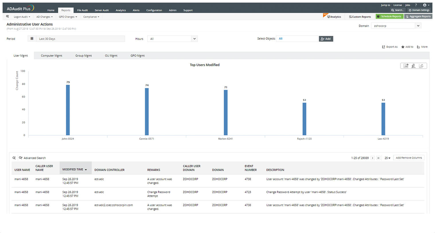 尽管可以不受限制地访问服务器和数据,但特权用户的活动通常是看不见的。借助 ADAudit Plus,您可以利用持续的特权用户活动审计和用户行为分析 (UBA) 来验证特权用户的行为是否正常。