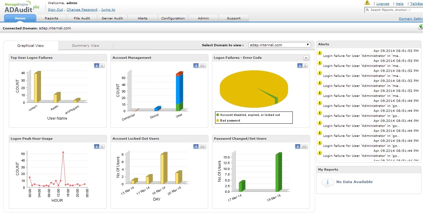 ADAudit Plus可帮助您监视Active Directory环境中的计算机活动。Windows监视工具帮助监视,审核和报表用户操作-“登录持续时间”,“登录失败”,“登录历史记录”,“终端服务活动”和“计算机上的用户登录持续时间”。现在,管理员可以监视用户工作站登录和注销时间的确切时间以及登录持续时间。在未经授权的进入或定期监控的情况下,这些关键数据是最容易查看的。ADAudit Plus确保您的组织具有Active Directory监视最佳实践的最高安全性。了解更多