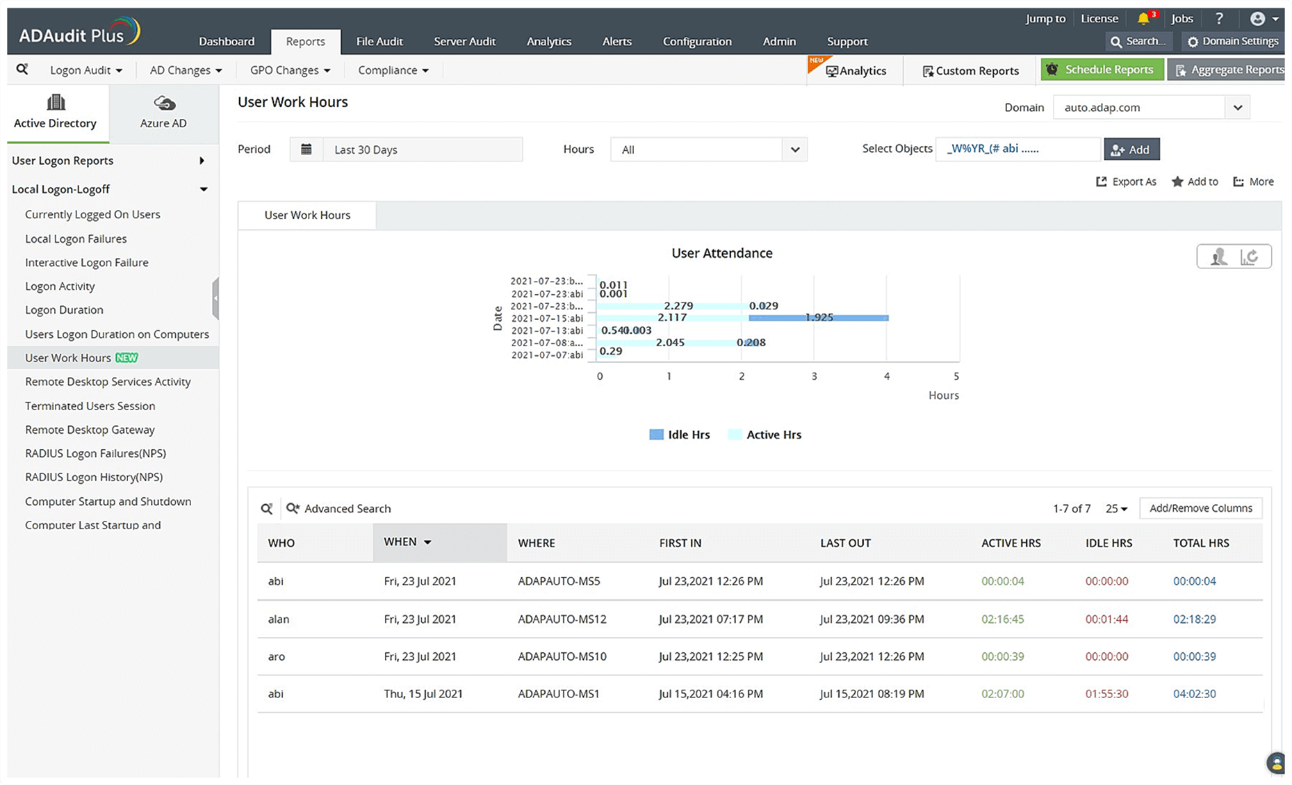 • 使用 ADAudit Plus 的内置综合报表了解谁尝试登录或注销、何时、在哪台机器上等等。