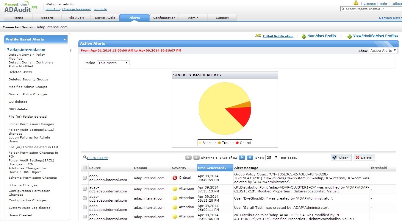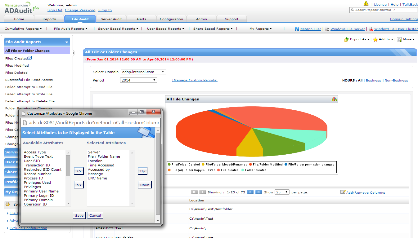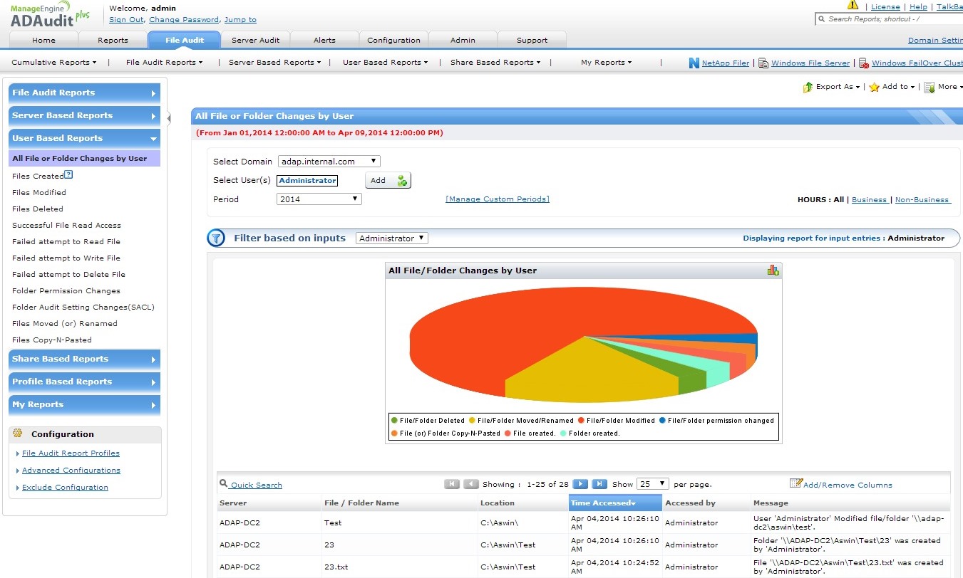 Windows文件服务器审计中最重要的监控功能,即“谁在Windows文件服务器中何时在何地影响了哪些变更”!作为管理员应有的技巧,他必须跟踪变更和/或生成取证的报表。有了ADAudit Plus,一切变得轻松简单 - Windows文件服务器审计!您可自动完成报表生成并直接在收件箱中找到它。