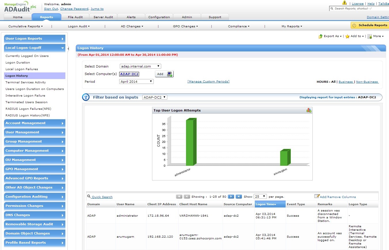 去除复杂性,无需再解释数千个复杂的安全描述符字符串并分析/报表它们。ADAudit Plus为您提供200多个简单、容易看懂的报表和即时电子邮件告警,包含每个事件的详细信息。例如:修改状态(已添加/移除权限)。使Windows Active Directory和Windows文件服务器更改审核自动化,通过数据治理、信息安全以及将报表导出为XLS、HTML、PDF和CSV格式获得完整的审核记录,以用于取证和满足各种合规要求。