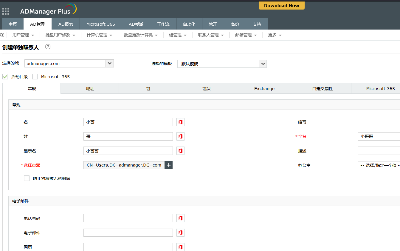 ADManager Plus是一个简单、易用、基于web、功能丰富、基于UI的Active Directory管理和报表工具,可以使创建和管理联系人的过程变得简化和轻松 - 不管是单个联系人还是批量联系人。