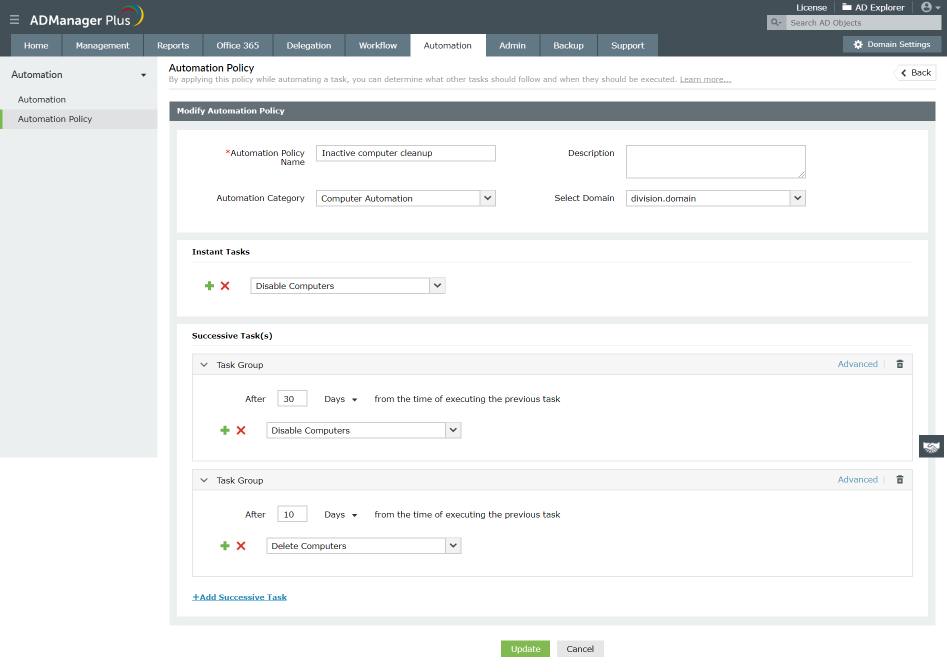 AD关键任务的完全自动化,例如用户供应,非活动用户清理等。还使您可以排序和执行后续任务,并与工作流混合以提供出色的受控自动化。